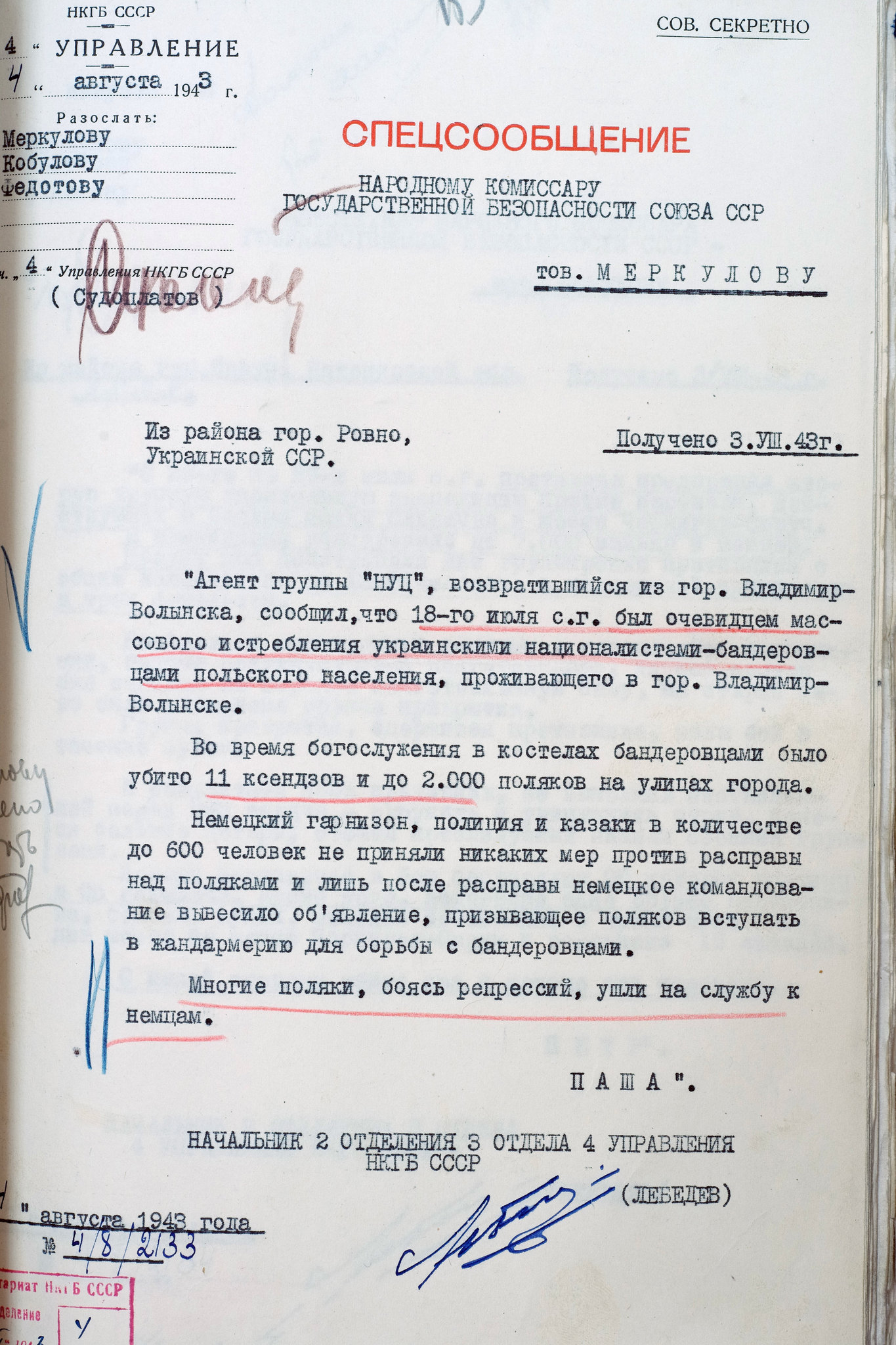 Архивные документы со спецсообщением 3 отдела 4 Управления НКГБ УССР в НКГБ СССР о массовом истреблении украинскими националистами поляков в городе Владимир-Волынске во время Второй мировой войны на территории Украины.