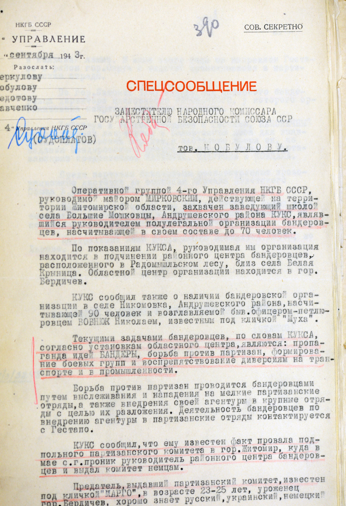 Архивные документы со спецсообщением 3 отдела 4 Управления НКГБ УССР в НКГБ СССР о захвате одного из главарей украинских националистов Кукса, во время Второй мировой войны в Житомирской области.