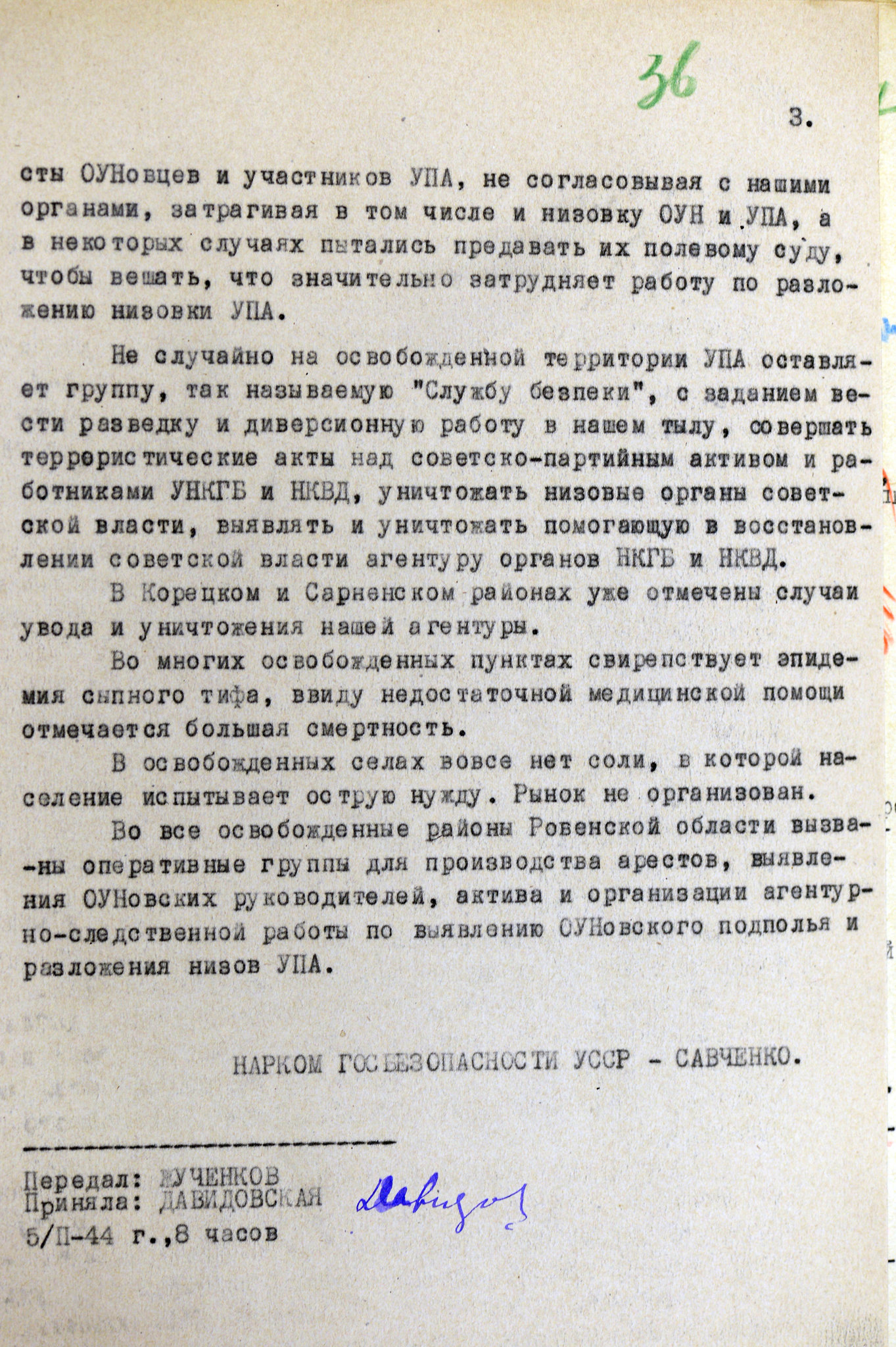 Архивные документы с докладной запиской НКГБ УССР в НКГБ СССР о положении в освобожденных районах Ровенской области во время Второй мировой войны на территории Украины.