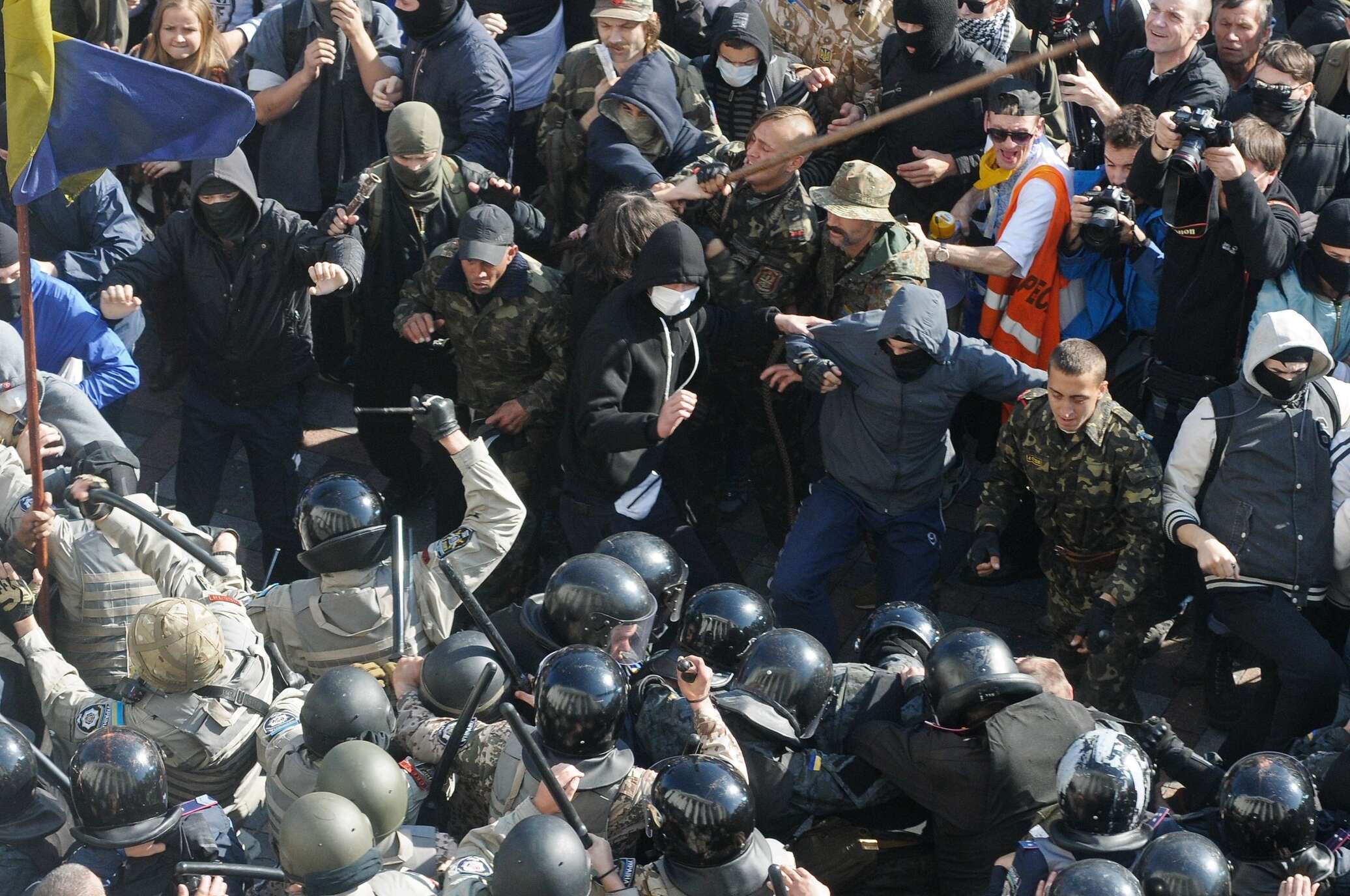 После этого у стен украинского парламента начались столкновения. В сторону сотрудников милиции полетели петарды и дымовые шашки. В ходе противостояния радикалы повредили четыре окна на втором этаже парламента. Они вели стрельбу по окнам из рогаток железными гайками, из пневматического оружия, также бросали в окна камни. Спикер Рады Александр Турчинов досрочно закрыл заседание.