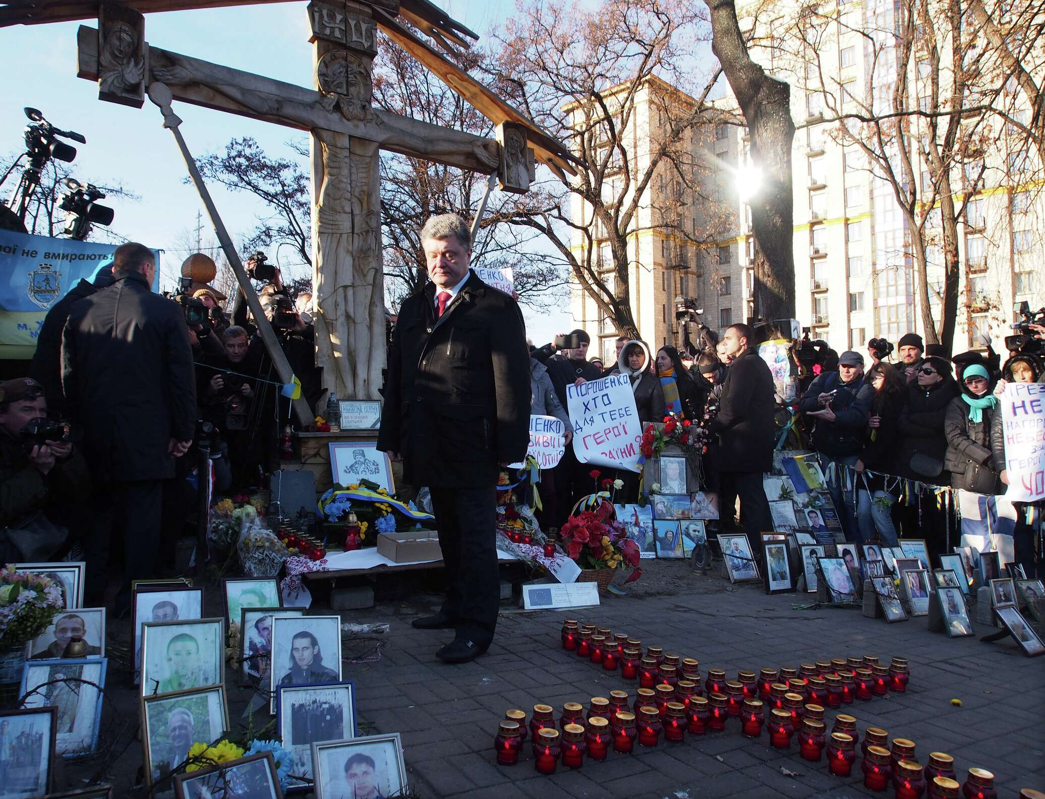 Толпа митингующих встретила Петра Порошенко криками «Позор!» и «Вы награждаете наших героев посмертно!», а также транспарантами «Порошенко, где убийцы?». При этом один из активистов напомнил, что пострадавшие в феврале на Майдане так и не получили специального статуса, который нужен для получения социальной и медицинской помощи.