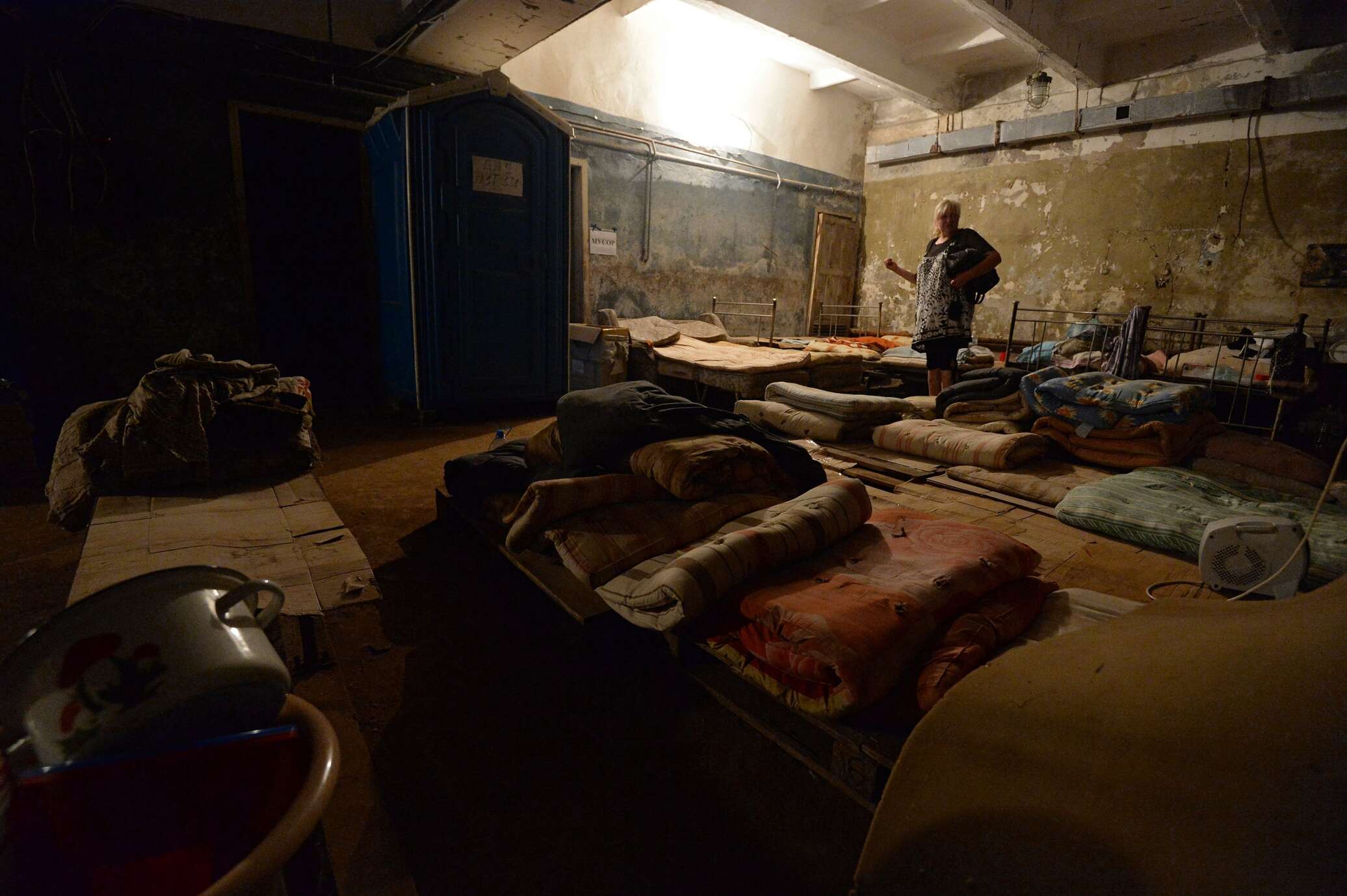 В этом сыром каменном отсеке в ряд стоят несколько десятков лежаков. Из-под них торчат пакеты, набитые вещами, картошкой и луком. Рядом табуреты, занятые кастрюльками и жестяными мисками, хлебом. Все стены в картинках, изображающих виды тяжелого оружия, горящие дома и людей в защитных комбинезонах, занятых тушением огня. Сверху надписи — «Борьба с пожарами в очаге ядерного поражения». Из соседнего отсека приходит гул голосов, удлиненный влажным эхом, какое может родиться только в сыром каменном мешке под землей. Кажется, что за стенкой находится больше сотни человек, но в действительности их там не более двух десятков — женщин и детей. Всего в этом убежище живут девяносто три человека.