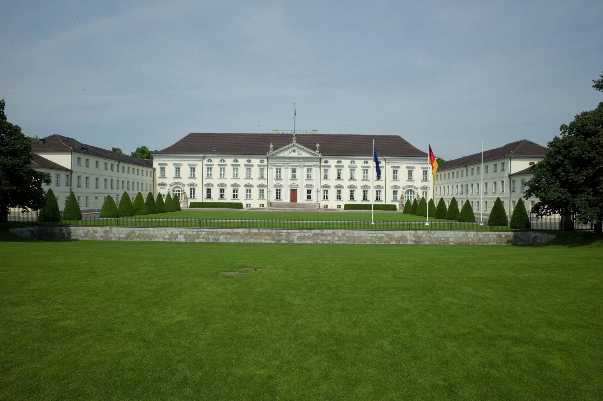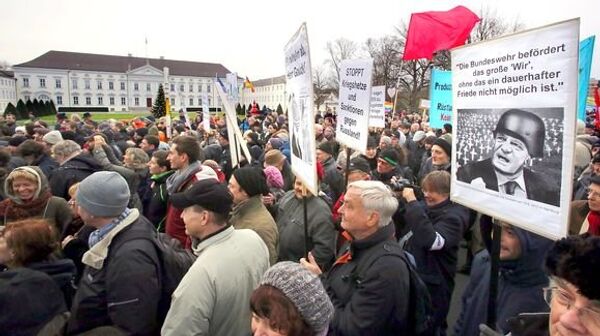 Митингующие собрались у резиденции президента Германии и выразили протест против увеличения численности войск, наращивания производства вооружений и военного экспорта, а также проведения политики конфронтации с Россией.