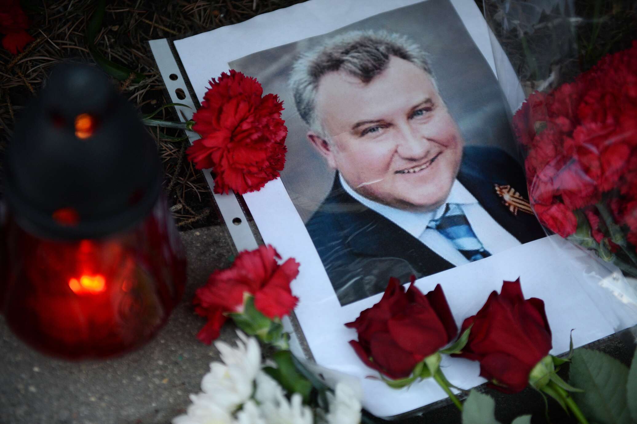 В колонне, направляющейся к Вечному огню, шел, в частности, сын Олега Калашникова — Вадим держал в руках транспарант с фотографией отца.