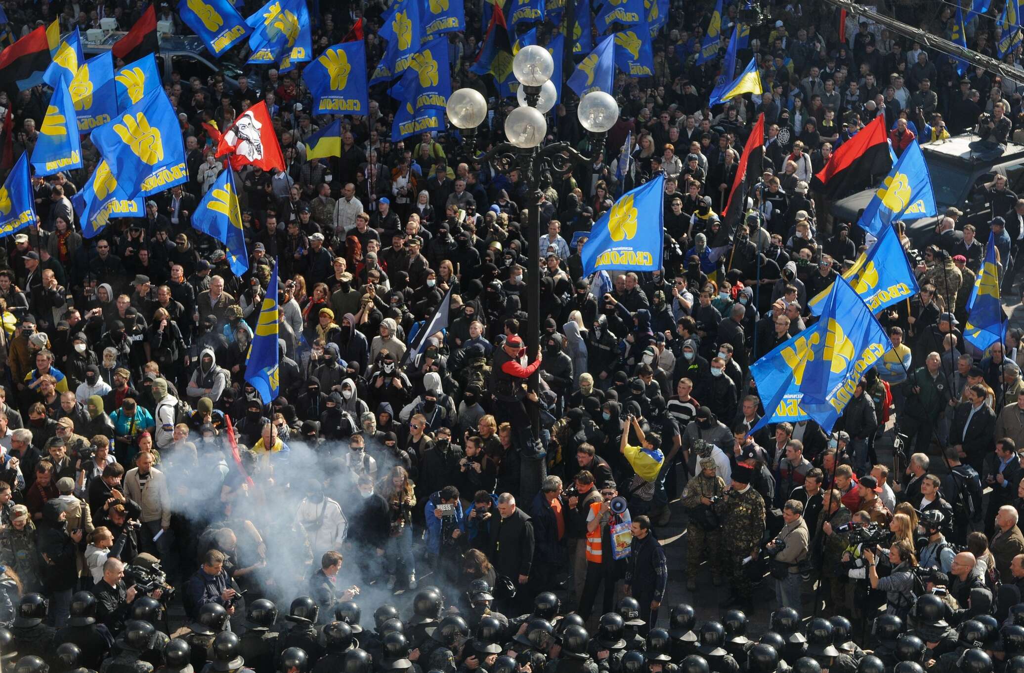 По имеющейся информации, между протестующими и сотрудниками спецназа произошло столкновение, были использованы слезоточивый газ и взрывпакеты. Участники акции бьют представителей правоохранительных органов длинными палками, из-за применения дымовых шашек площадь покрылась черным дымом. Митингующие начали раскачивать установленное вокруг парламента металлическое ограждение.