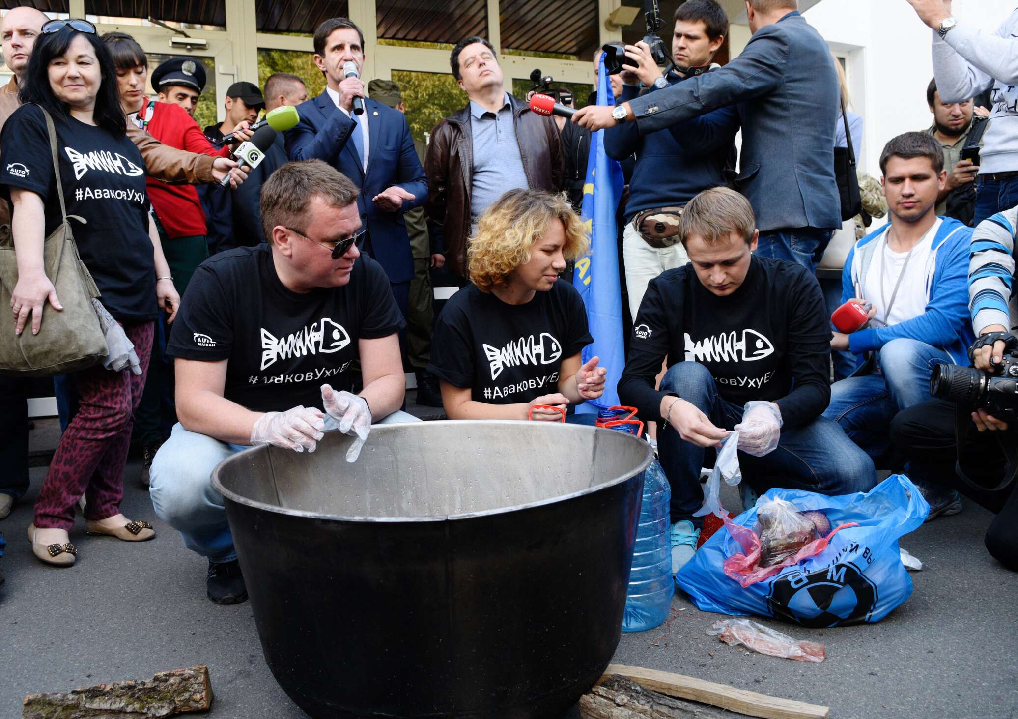 Участники вынесли к двери МВД котел, в котором они намерены готовить уху для министра внутренних дел Украины, передает телеканал «112 Украина».