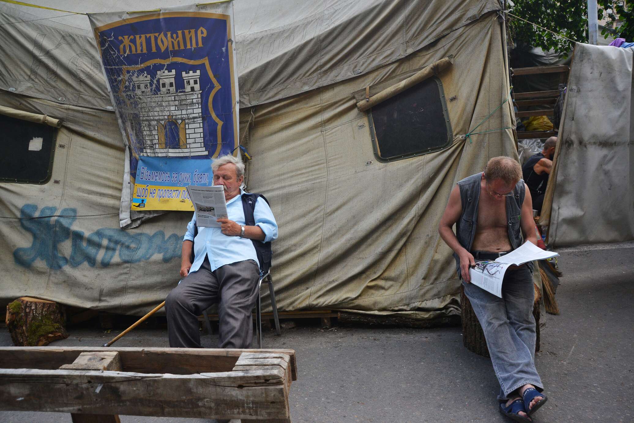 — Я на «Свободу» согласился, потому что выхода нет. Летом работал в Киеве, мыл бутылки на пивном заводе «Оболонь», но жить стало холодно в будке, и пришлось вернуться в Житомир. А квартиру я свою отдал дочке, и теперь вот перебиваюсь, как могу, а зять меня не очень хочет видеть из-за того, что я пью. Если честно, то мне «Свобода» тоже не нравится. Но Житомир такой город, что некуда мне идти, хоть помирай. У нас тут одно время «Правый сектор» был очень активный, я им тоже помогал. Они памятник Ленину и Карлу Марксу свалили, я тоже помогал валить. «Правосеки» ходили тут строем, народ пугали, а сейчас куда-то подевались, и нет их. Весной снова в Киев поеду. Там работа есть пока, — поделился своими мыслями Коля.