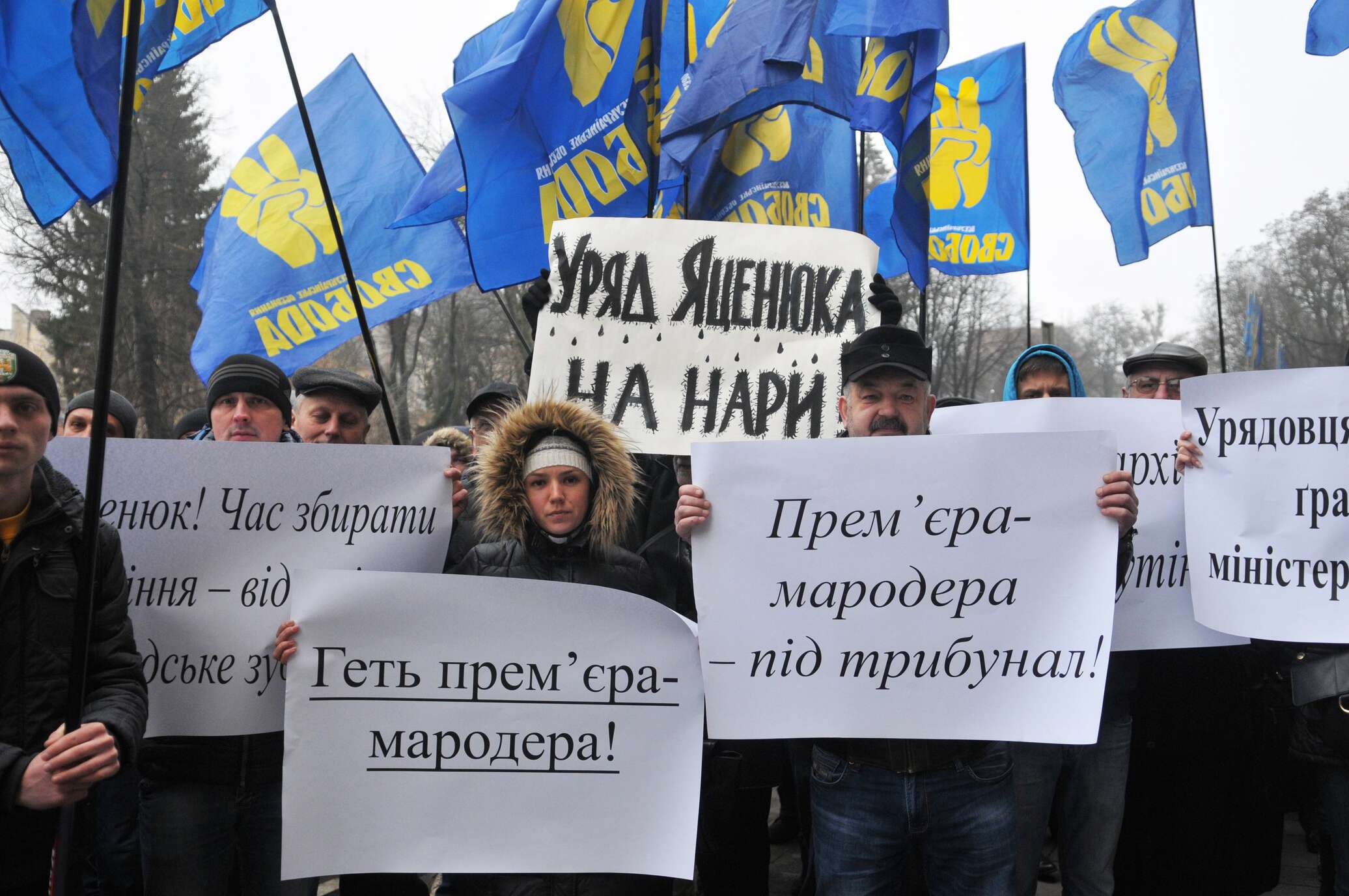 Участники акции держат плакаты с лозунгами «Сколько еще правительство будет разрушать экономику?», «Заплатил за коммуналку — зубы на полку», «Правительство Яценюка — марионетка олигархов».