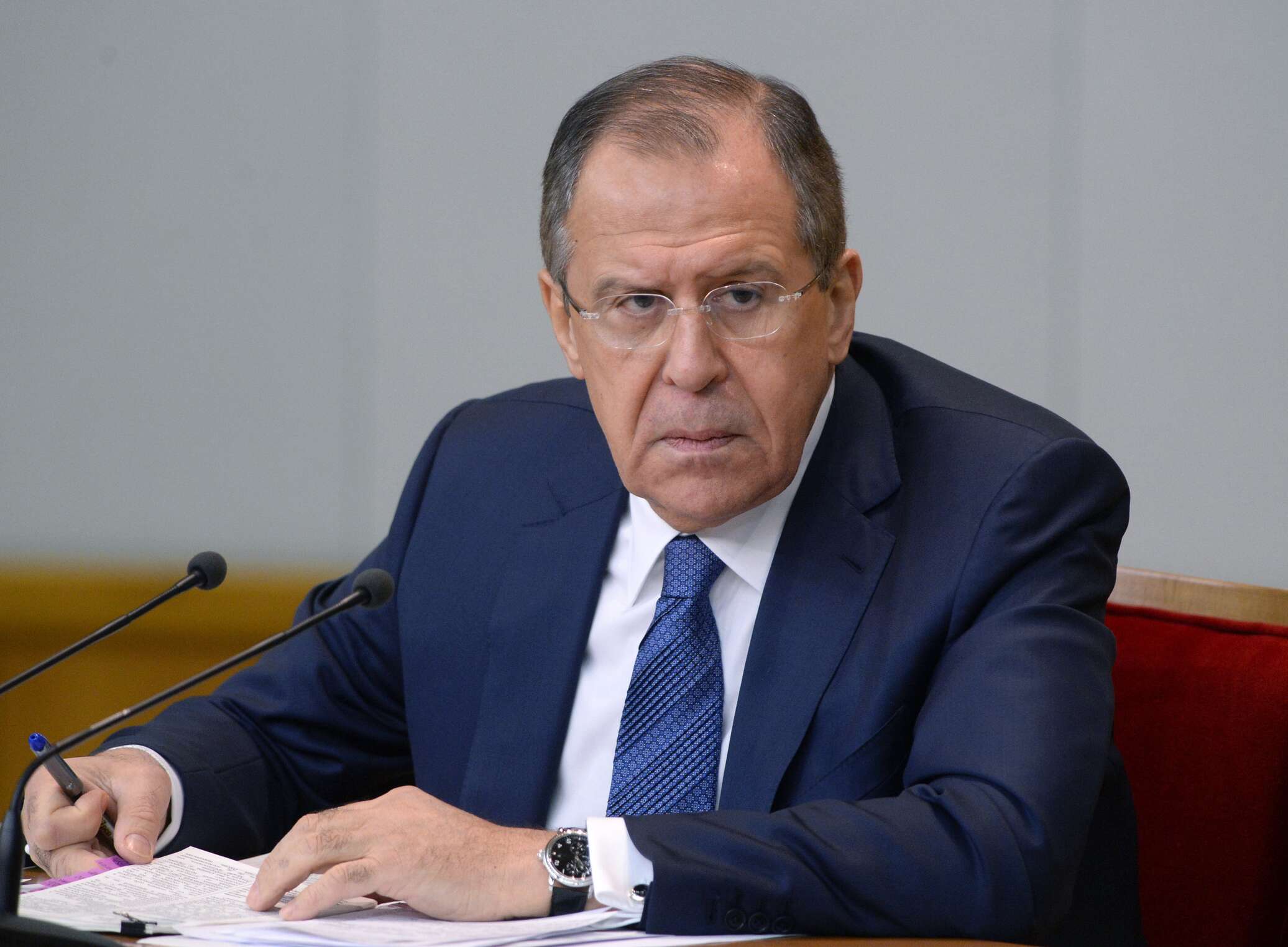 © РИА Новости . Григорий Сысоев / Перейти в фотобанкПресс-конференция министра иностранных дел РФ С. Лаврова по итогам 2015 года