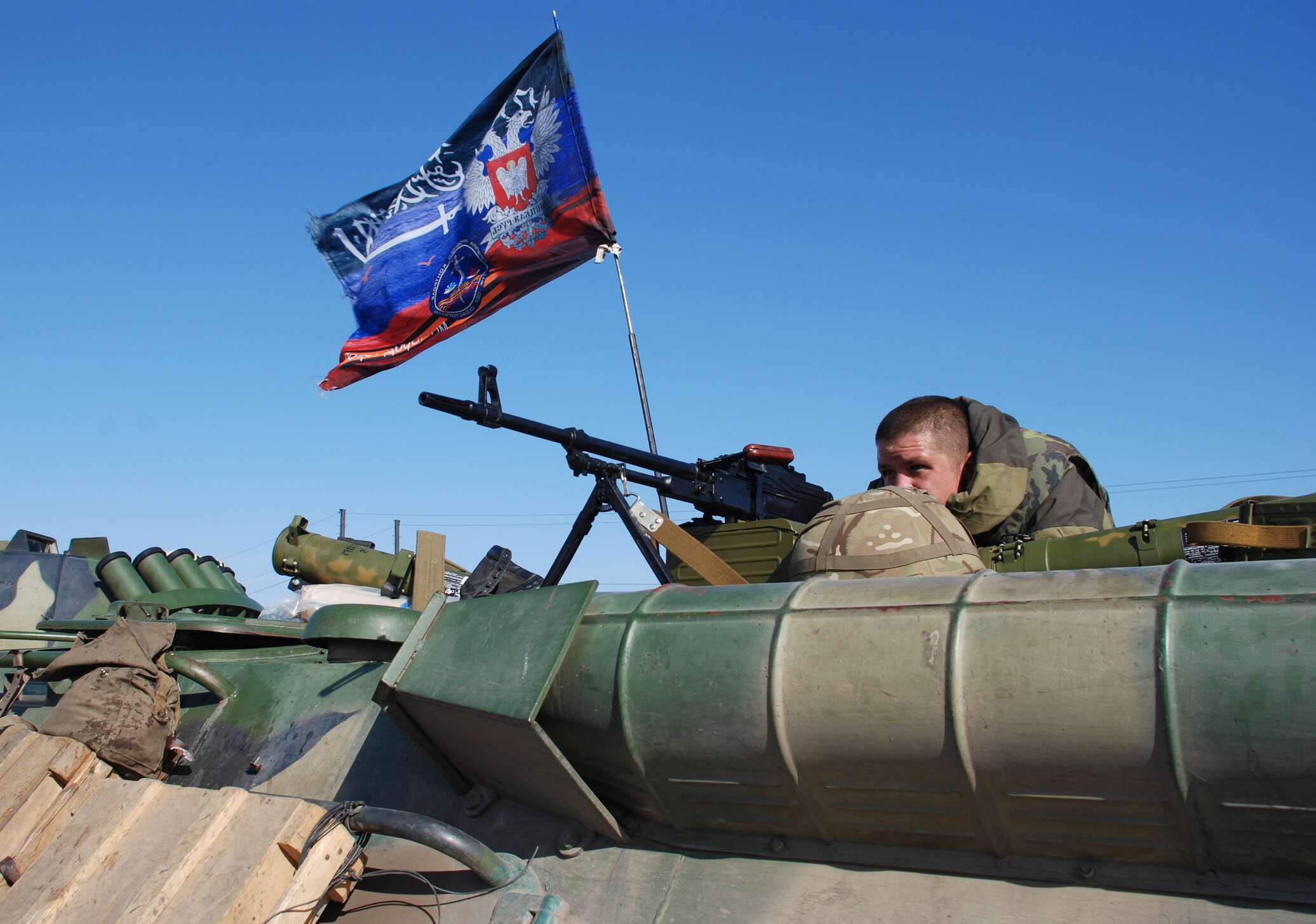 «Правый сектор» стоит напротив нас. Там висит перевернутый украинский флаг: это означает, что стоит нацбатальон. С карьера работают минометы», — заявил сотрудник МВД ДНР Дмитрий.