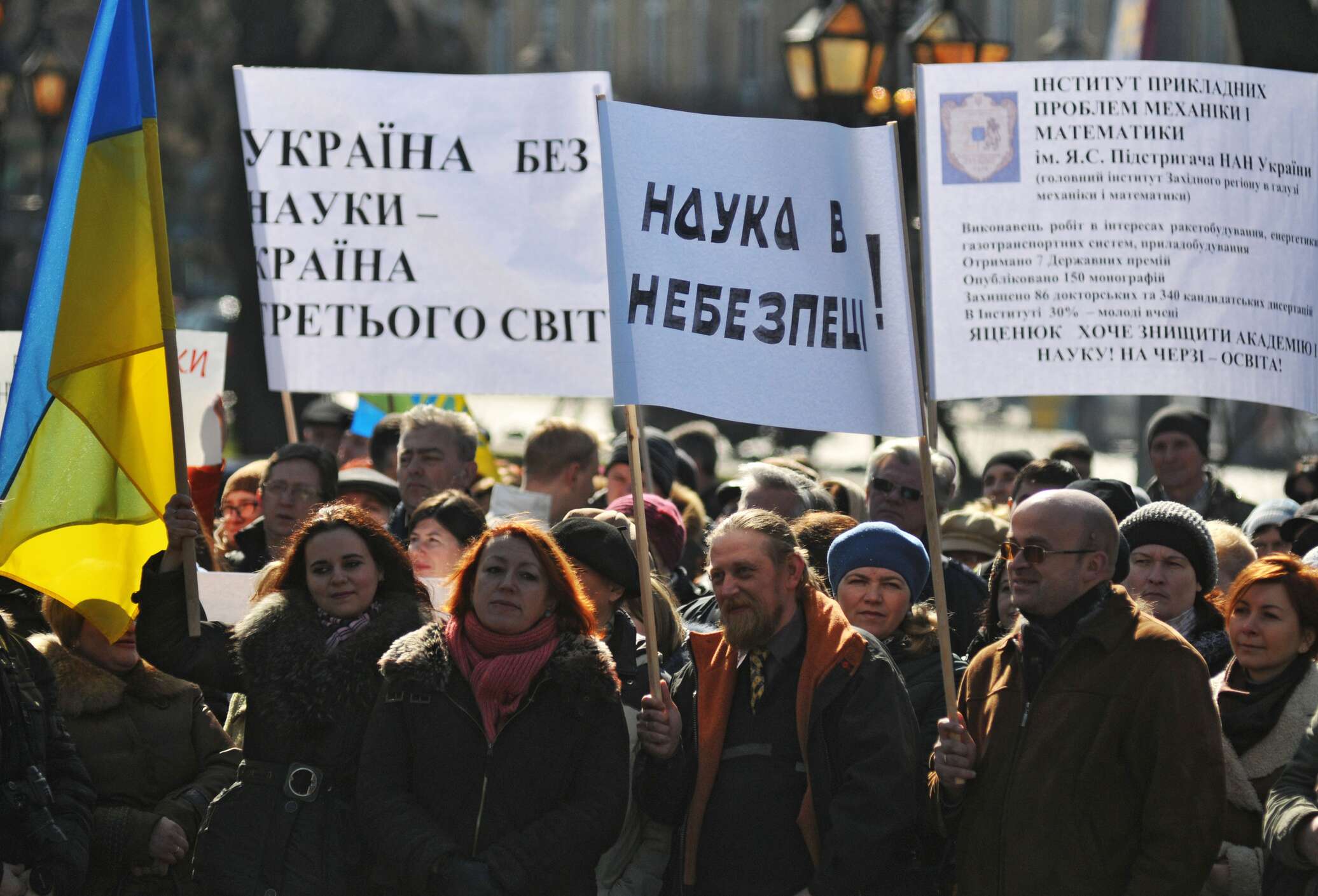 Как сообщают «Украинские новости», во вторник около 500 человек расположились возле главного входа в украинский парламент, а остальные протестующие вышли на проезжую часть улицы Грушевского и частично ее заблокировали. Участники акции держат плакаты с надписями «Финансируешь науку — будущее» и «Украина без науки — страна без будущего».