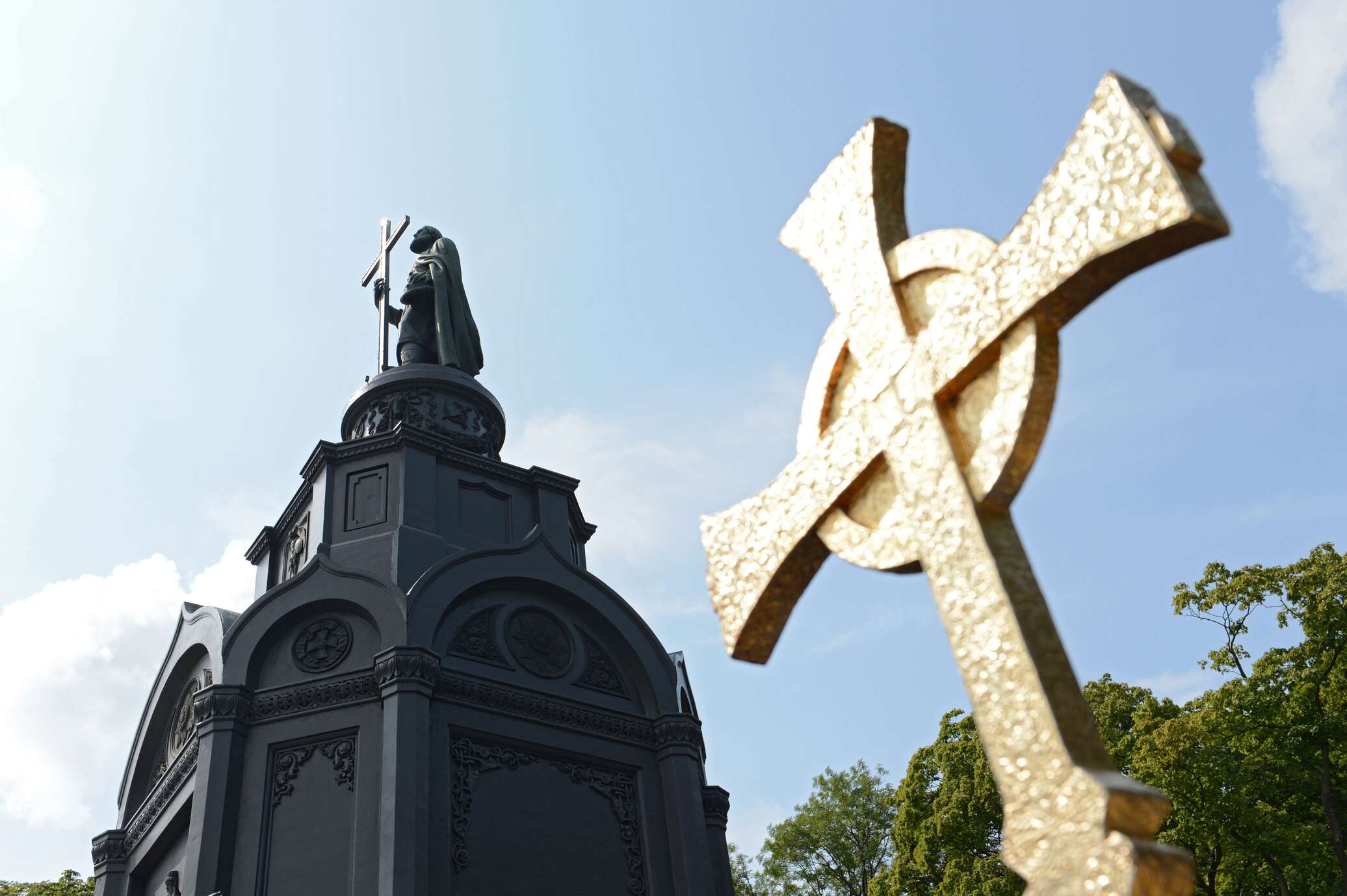 Вандалы разрисовали памятник князю Владимиру, установленный в киевском парке «Владимирская горка».