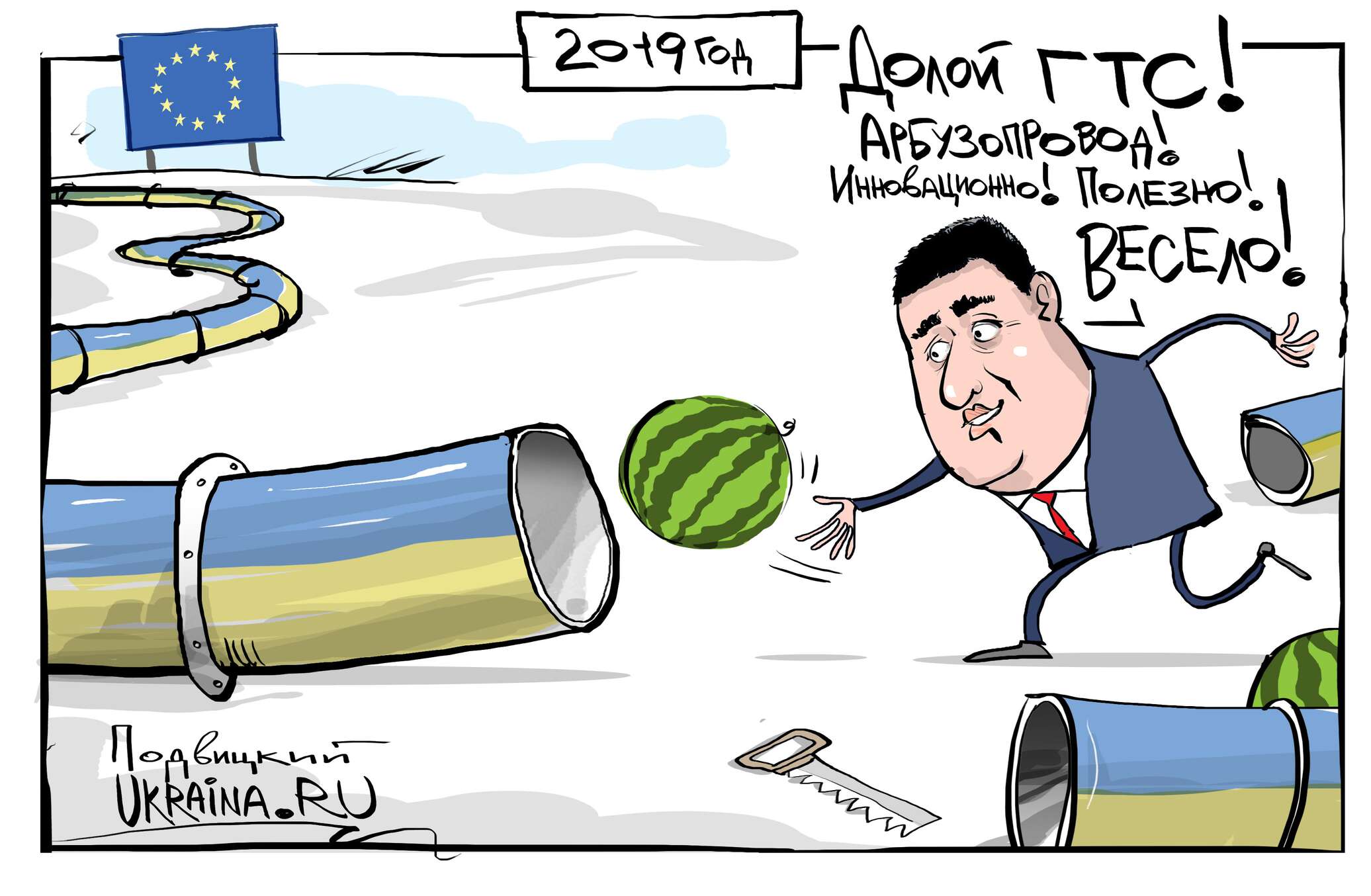 Евросоюз стирает с газовой карты Украину, давая «добро» на использование «Серверного потока». Украинский газопровод автоматически превращается в хлам. В это же время премьер-министр Украины торжественно рапортует о запуске баржи с арбузами с юга Украины в Киев. Над пафосом посреди разрухи смеются даже самые патриотичные граждане.