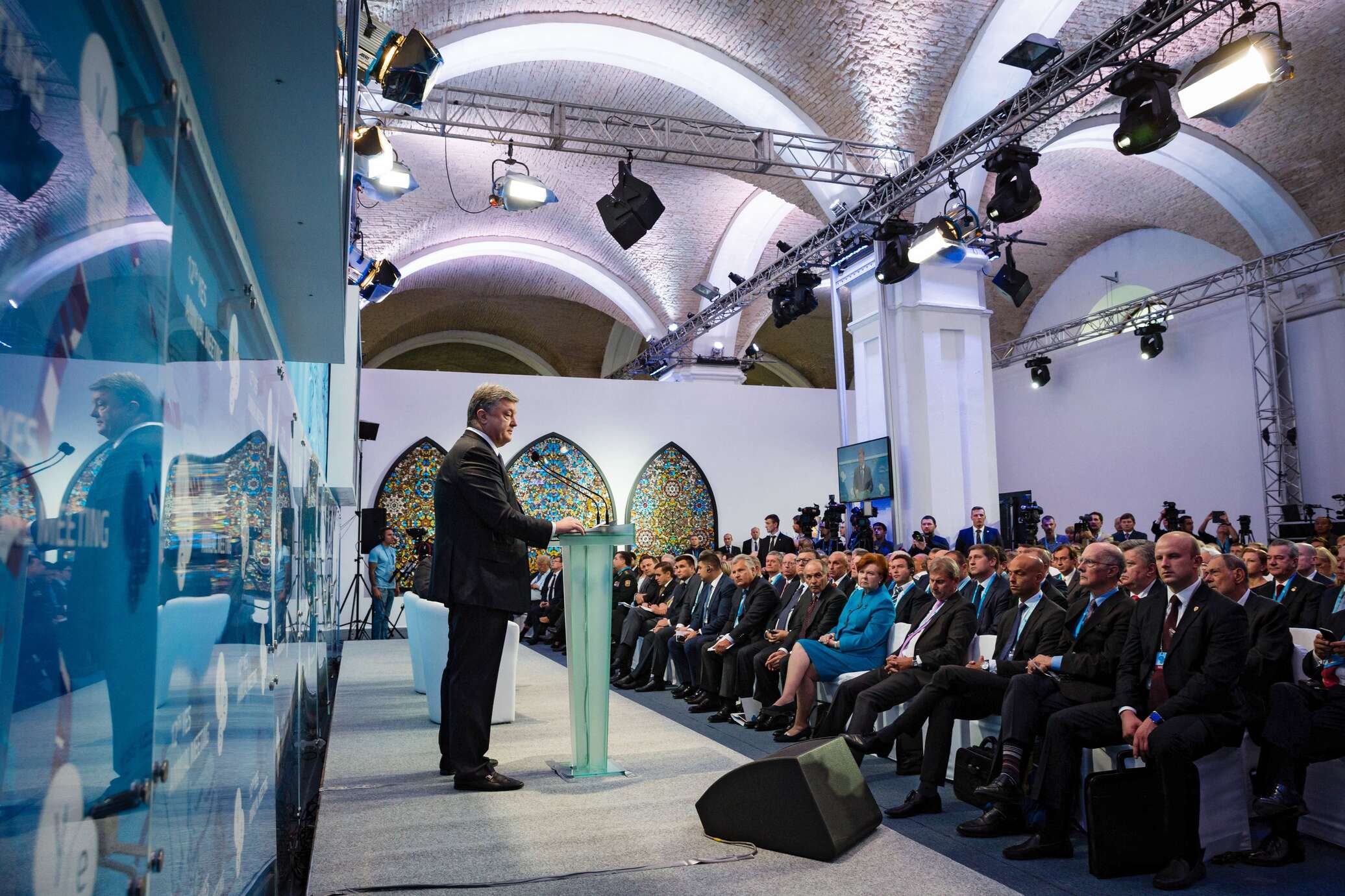 «Есть ли на Украине коррупция? Конечно. Но мы прошли большой путь по ее преодолению. Возьмите любую сферу, каждую неделю арестовываем коррупционеров, в том числе участников коалиции, изобрели программу электронного декларарирования. Теперь чиновники должны объяснить, откуда взяли дорогие виллы, машины, часы. Завтра мы презентуем судебную реформу. Наша программа на этот год очень амбициозна. Образовательная, пенсионная реформа, хоть непопулярная, но решительная, реформа здравоохранения, образования. Несколько дней назад мы обсудили приватизационный закон в соответствии с западными консультациям. И лист реформ очень длинный», — сказал Порошенко.
