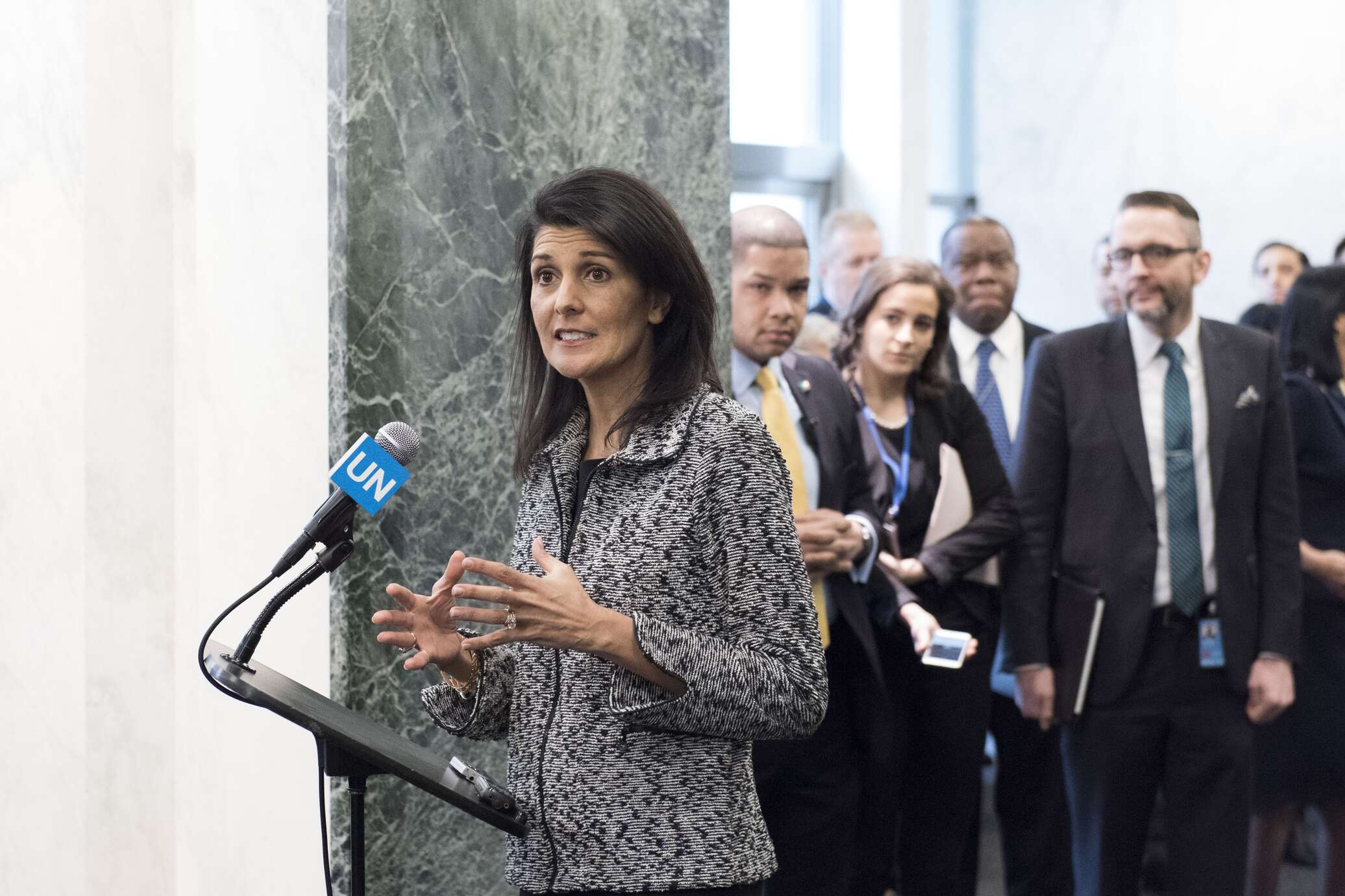 Хейли заявила, что ей известно об этой стране. Она назвала правильным стремление Биномо к независимости, и отметила, что Москва, безусловно, вмешалась в ситуацию.