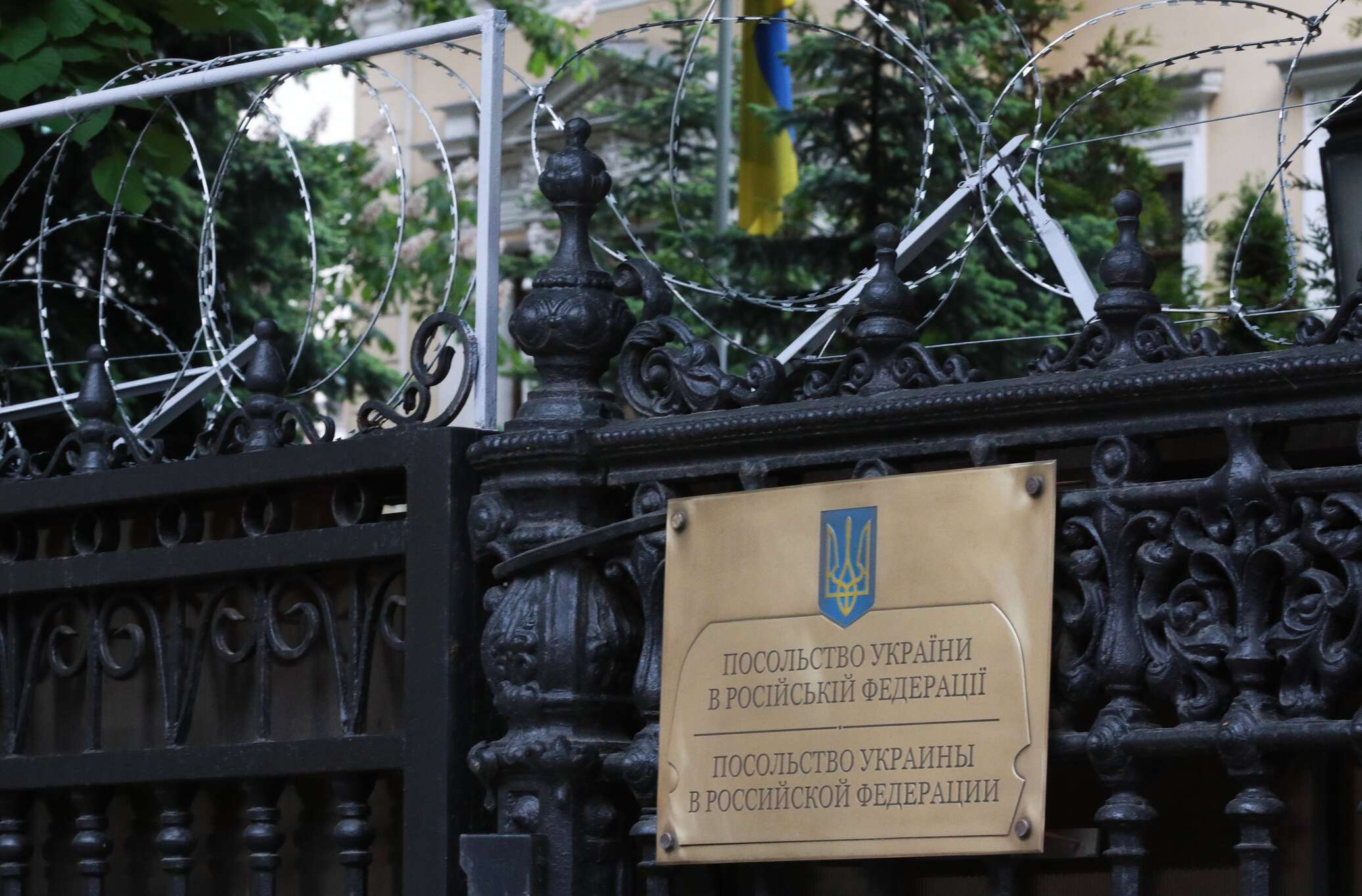 Сотрудники полиции, пост которых неподалеку, лишь пожимают плечами. Все, что происходит на пороге посольства Украины — личное дело этой страны. Ведь территория посольства считается под юрисдикцией Украины.