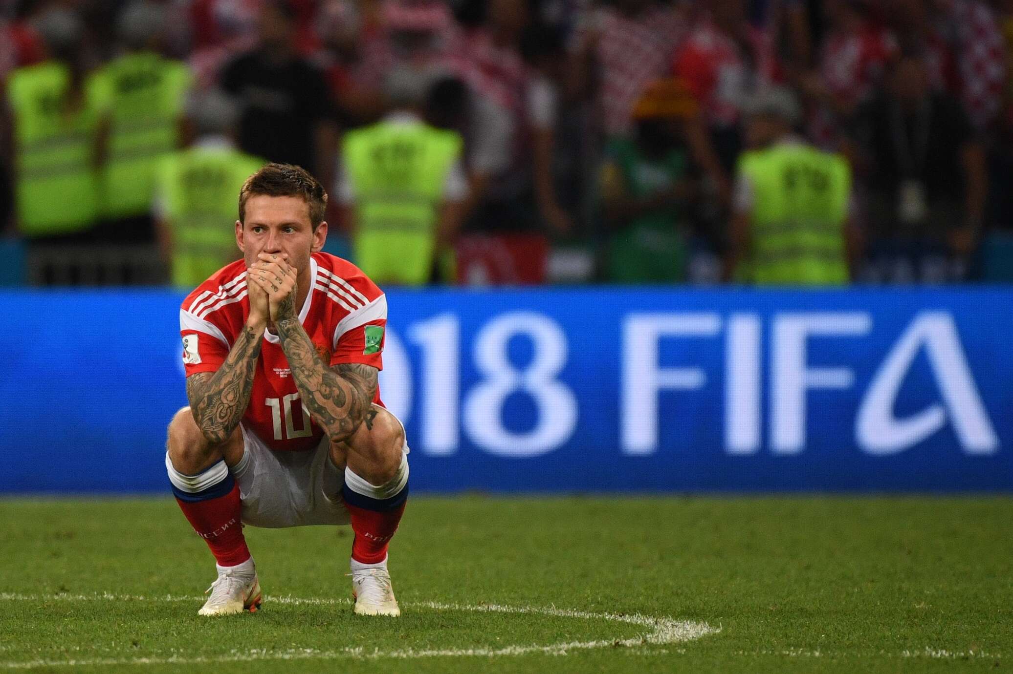 Россия и Хорватия разыграли путёвку в полуфинал на сочинском стадионе «Фишт». На 31-й минуте Денис Черышев забил первый гол, но спустя 8 минут Андрей Крамарич сравнял счёт, выявить победителя в основное время не удалось, а в овертайме на 101-й минуте Домагой Вида вывел свою команду вперёд, но за 5 минут до окончания дополнительного времени Марио Фернандес отправил мяч в сетку ворот хорватов. Исход матча снова решили 11-метровые. Фёдор Смолов, которому доверили совершить первый удар, отправил мяч прямо в руки хорватскому вратарю, а Марцело Брозович сумел обхитрить Игоря Акинфеева — 0:1. Вышедший вторым Алан Дзагоев бьёт точно в цель, а затем капитан российской команды отбивает удар Матео Ковачича — 1:1. Марио Фернандес, благодаря которому серия пенальти стала возможной, перемудрил и ударил слева от ворота, зато Лука Модрич успешно реализовал возможность — 1:2. Четвёртая пара игроков — Сергей Игнашевич и Домагой Вида — добавили по одному очку в копилку своих команд — 2:3. Далер Кузяев и Иван Ракитич тоже не дрогнули. В результате борьбу на турнире продолжает сборная Хорватии, которая сыграет в полуфинале 11 июля на «Лужниках» с Англией.