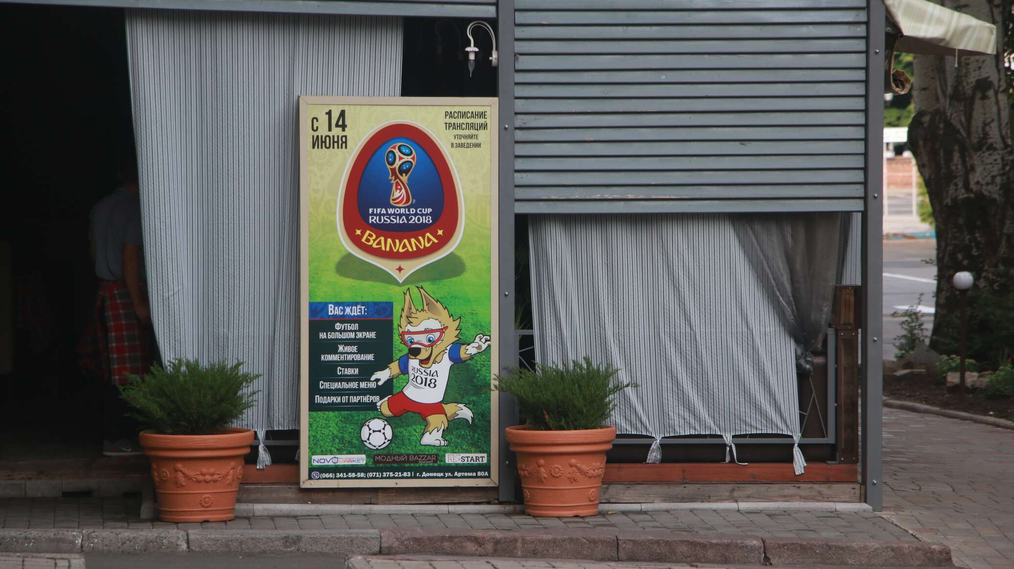 Однако те кафе и рестораны, что остались открыты, не упустили шанс немного заработать, организовав трансляцию в этот вечер: они полны посетителей. В некоторых кварталах, составленных из типовых двухэтажных домиков еще сталинской застройки, можно увидеть и просмотры всем двором, которые были так характерны для советских времен. Однако, здесь это уже скорее экзотика. Еще севернее, в районе поселка Спартак, футбол не смотрит никто — здесь нет ни электричества, ни воды, ни газа. Да и жителей осталось с полсотни человек из довоенных нескольких тысяч — севернее только фронт, который собственно и проходит по поселку. Восточнее лишь взлетная полоса разрушенного аэропорта.