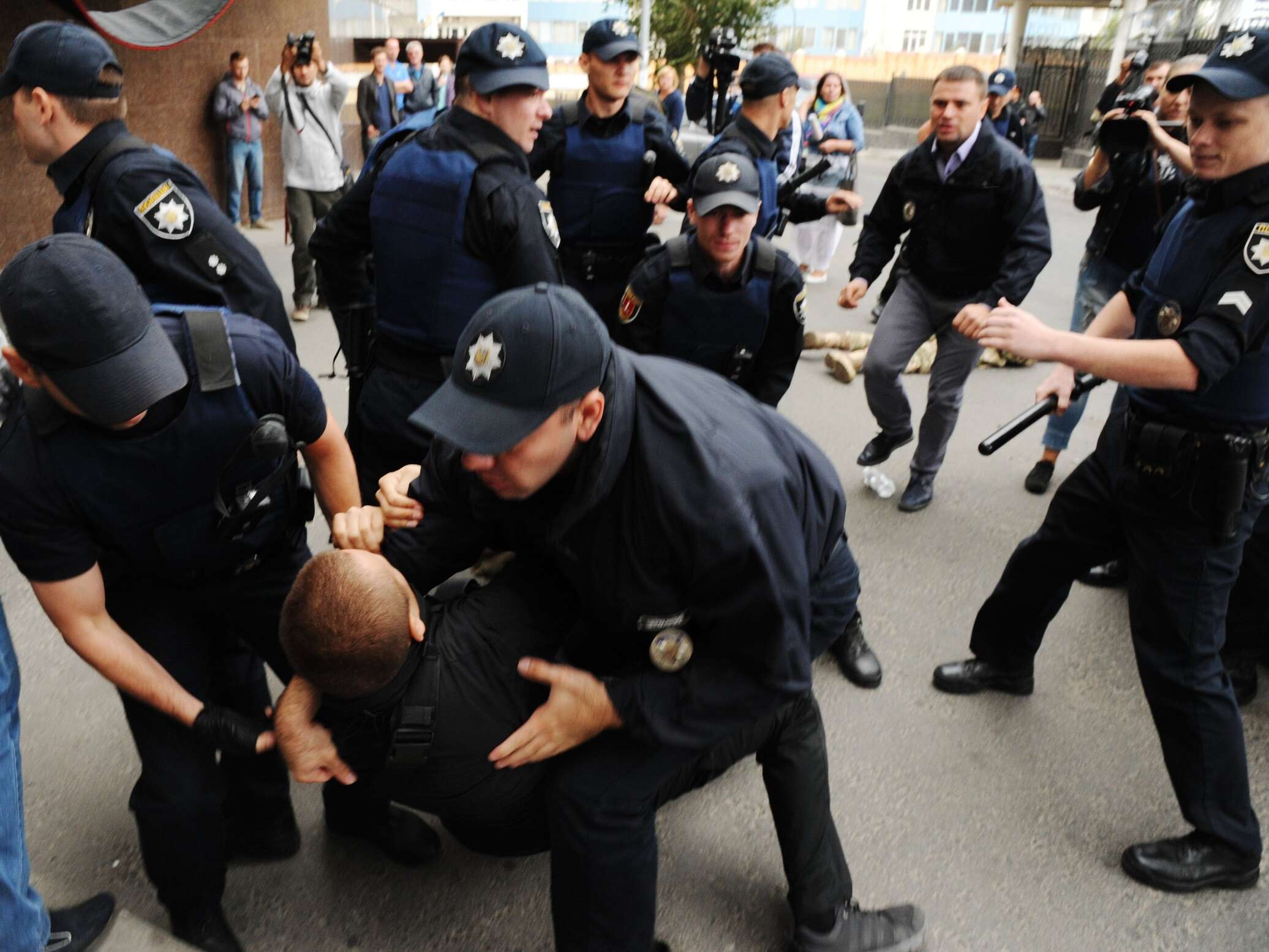 Стычка произошла возле Голосеевского районного суда Киева. В здании в это время выбирали меру пресечения одному из координаторов С14 Сергею Мазуру — по делу о разгроме и сожжении цыганского лагеря на Лысой горе в украинской столице.