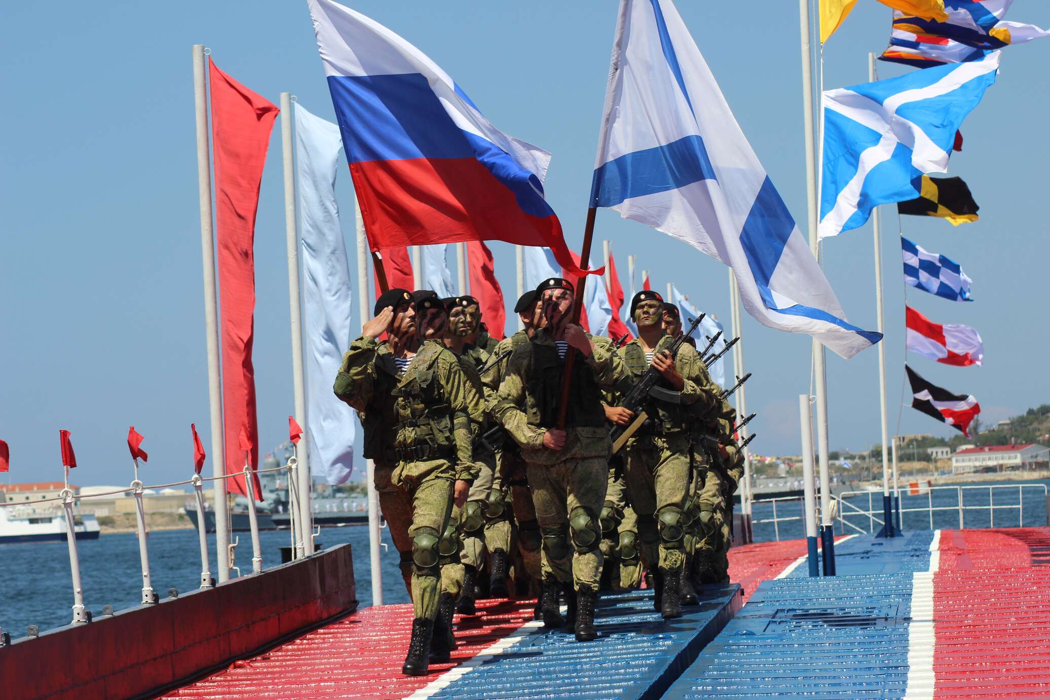 Суматоха и трудности с попаданием на удачные места на трибунах объясняются размахом празднования главного флотского дня. Центр Севастополя буквально замирает на время проведения торжественных мероприятий. Всем желающим открывается доступ на палубы военных кораблей, демонстрируется лучшая военная техника, в которой можно посидеть и «порулить», мальчишек просто сводят с ума стенды со стрелковым оружием, где можно подержать в руках АК-47 и СВД.