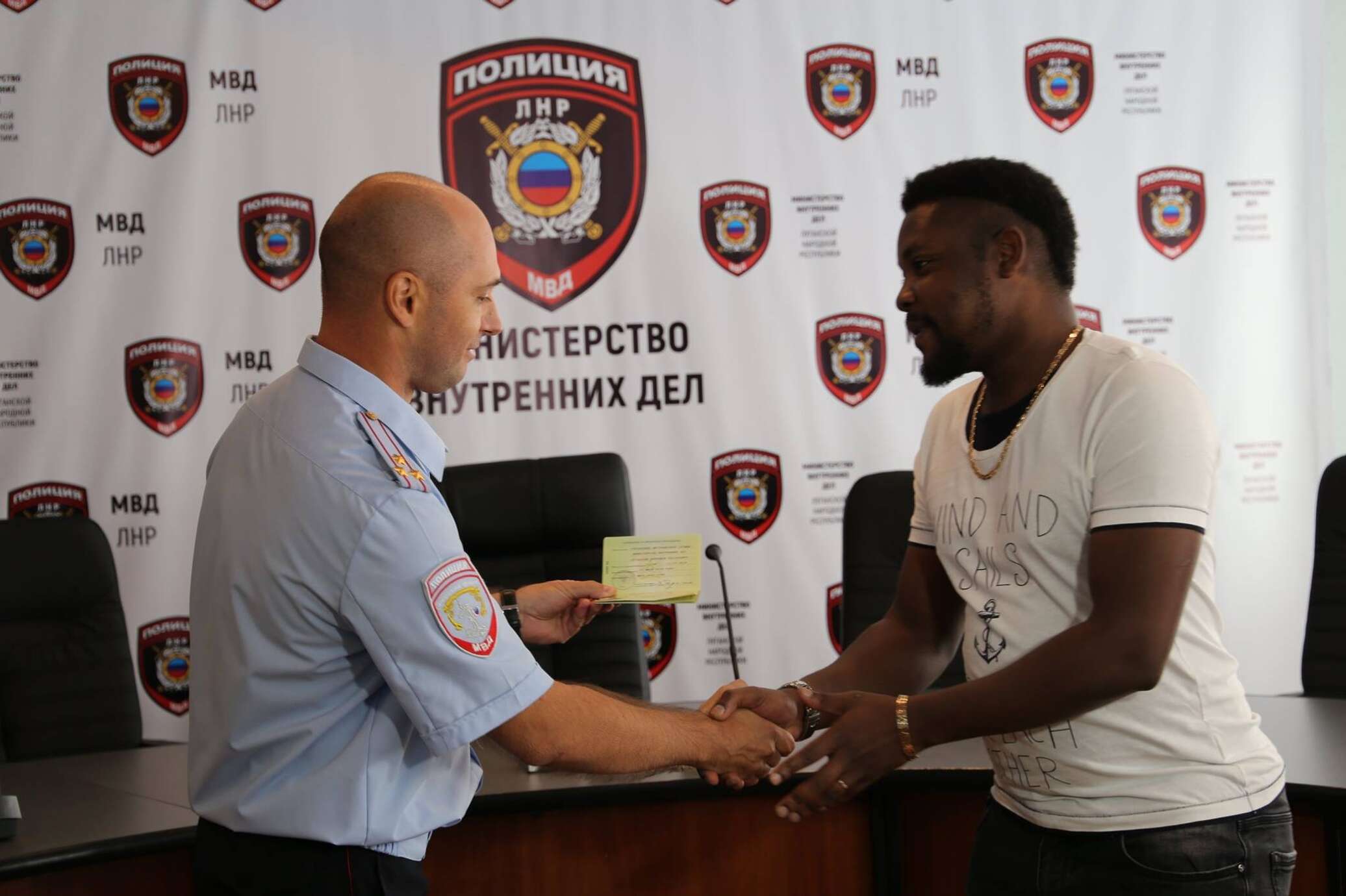 «Первое разрешение на временное проживание для иностранцев гражданину Конго торжественно вручил заместитель министра внутренних дел Луганской народной республики Михаил Параскеев», — говорится в сообщении МВД.