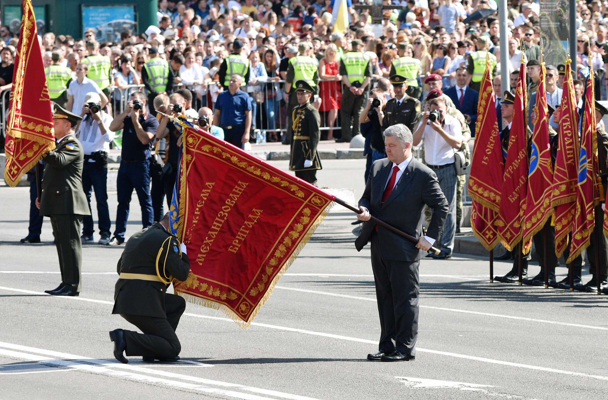 И можно было бы посмеяться и над старой-новой техникой, и над упавшим во время речи украинского президента Петра Порошенко солдатом из почетного караула, а также над довольно скромной воздушной частью парада. Если бы не громкое «Слава Украине!», впервые звучавшее на параде в качестве официального приветствия, а также новый марш Вооруженных Сил Украины «Зродились ми великої години», который на самом деле является «Маршем украинских националистов», утвержденный в 1932 году руководством ОУН в качестве гимна этой организации.