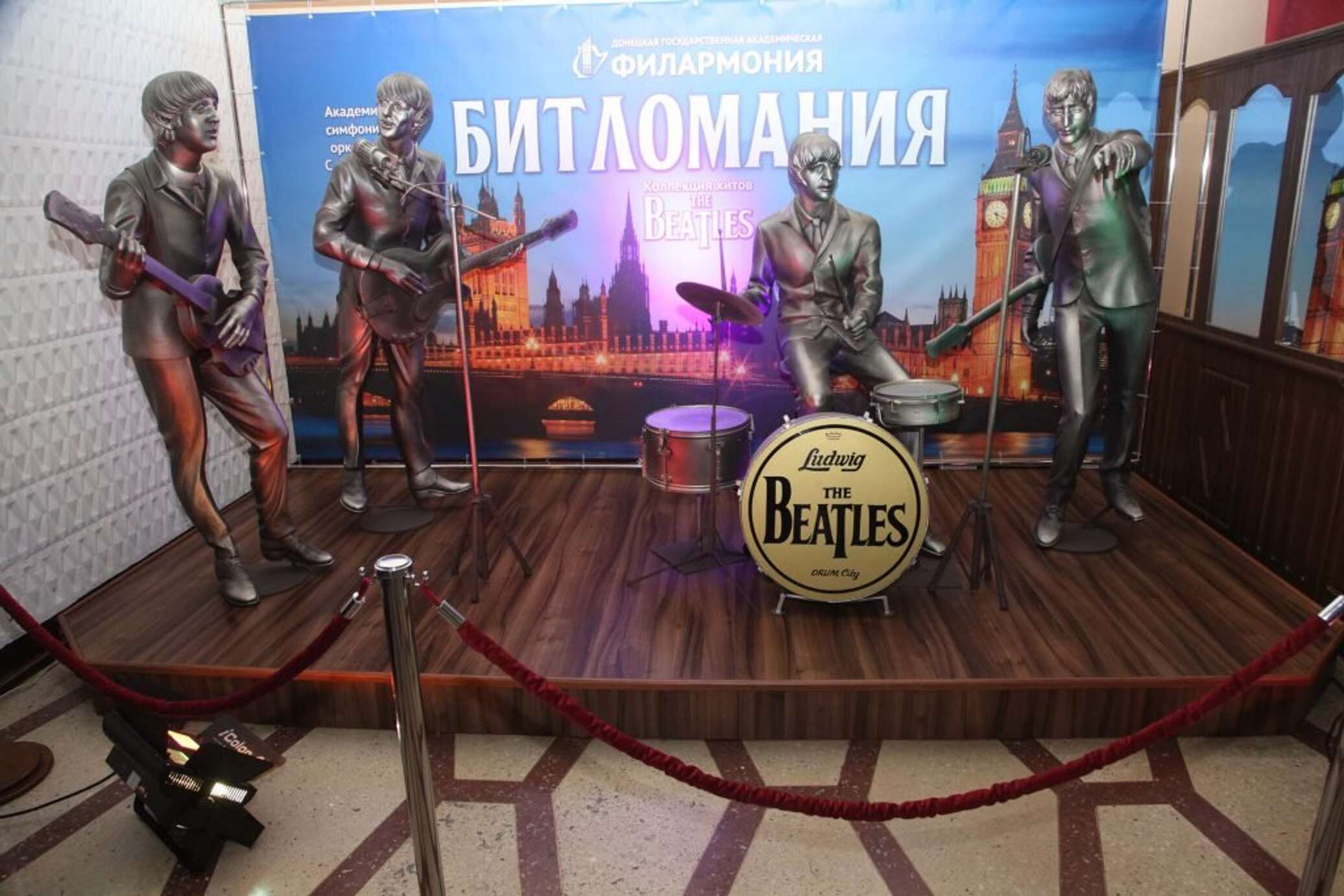 «Уже очень много говорилось о судьбе скульптурной композиции группе «Битлз», которая с 2006 года стояла на проспекте имени Богдана Хмельницкого. Некоторые дончане очень переживали, что она будет утеряна. Говорили, что ее сдадут на металлолом, хотя, нужно отметить, что она оказалась из пластмассы. И вот, с сегодняшнего дня она установлена в фойе филармонии. Она посвящена программе «Битломания» с симфоническим оркестром, подготовленной Данилом Милкой, которая будет представлена 25 октября. Мы помогли восстановить эту композицию и создали великолепную фото-зону к новой программе. Ремонтно-восстановительные работы проводила донецкая мастерская «Керамический дизайн». — рассказал художественный руководитель филармонии Александр Парецкий.