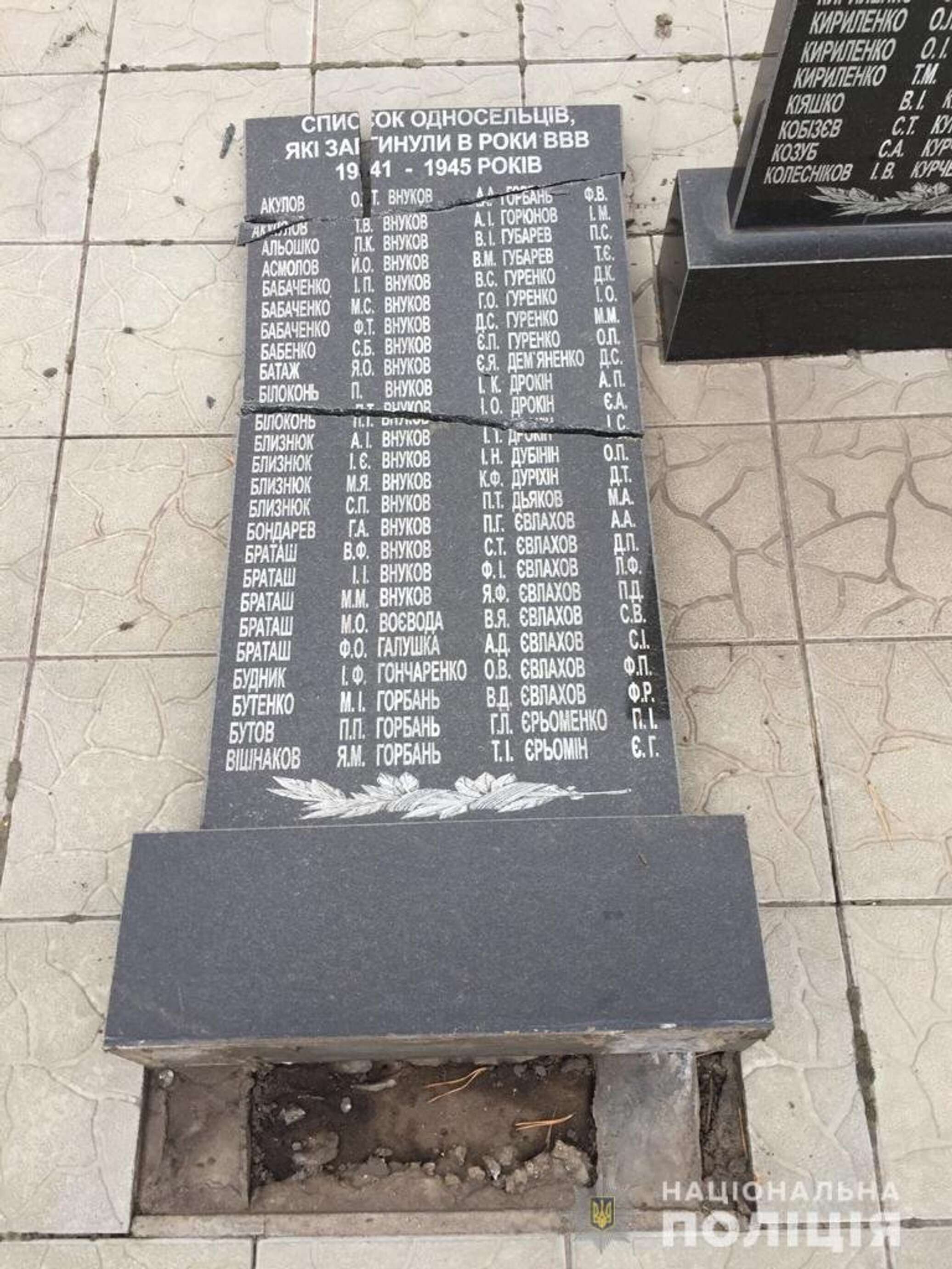 Инцидент произошел в одном из сел, входящих в Циркуновский сельсовет в Харьковском районе области. Злоумышленники избрали мишенью стелу мемориала погибшим односельчанам в годы Второй мировой войны