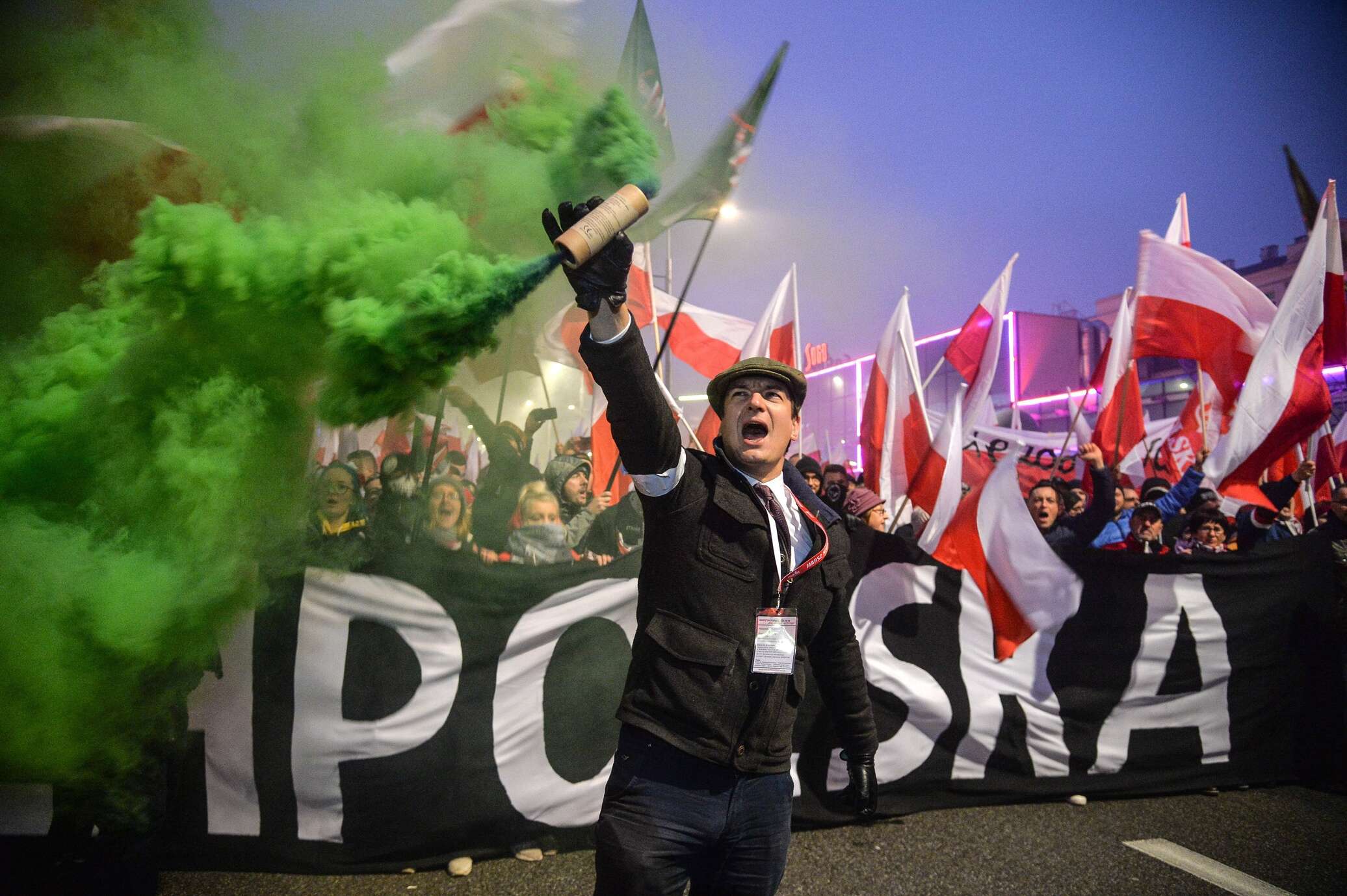 Конечно, без инцидентов не обошлось. Во время прохождения колонны националистов звучали лозунги «На деревьях вместо листьев будут висеть коммунисты», «Не радужная, не красная — только Польша националистическая», «Львов и Вильно — всегда польские», «Спасти Европу от эмигрантов», представители «Всепольской молодёжи» сожгли флаг Европейского Союза. А когда марш проходил мимо контрпикета либералов, в их сторону полетели файеры и бутылки, однако полиция успешно разделила конфликтующих.