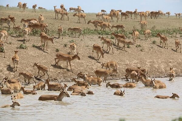 Сайгак (Saiga tatarica) принадлежит к группе родов антилоп. Житель степей, который ранее широко заселял Европу и Азию, а сейчас сохранился только в Казахстане, Узбекистане, Кыргызстане, в РФ (Калмыкия) и на западе Монголии. Сайгаки — кочевые животные и осуществляют сезонные переселения из летних пастбищ в степях до зимних пастбищ в пустынных районах. Еще в XVII—XVIII столетиях сайгак населял все степи и полупустыни Европы и Азии: от предгорий Карпат на западе до Монголии и Западного Китая на востоке. На севере в те времена доходил до Киева, Барабинской степи в Сибири. Однако во второй половине XVIII века в результате освоения человеком степных пространств сайгак почти исчез в Европе. В прошлом сайгак заселял степи Украины на запад до самых Карпат (степь Пантелиха). Вид исчез на территории Украины в XIX веке в результате прямого преследования человеком. Последнее животное было убито в 1898 г. возле с. Преображенка в 43 км от Аскании-Нова. Сегодня в полувольных условиях сайгаки сохраняются на Украине в биосферном заповеднике «Аскания-Нова». По состоянию на 2015 год стадо насчитывало до 600 голов.