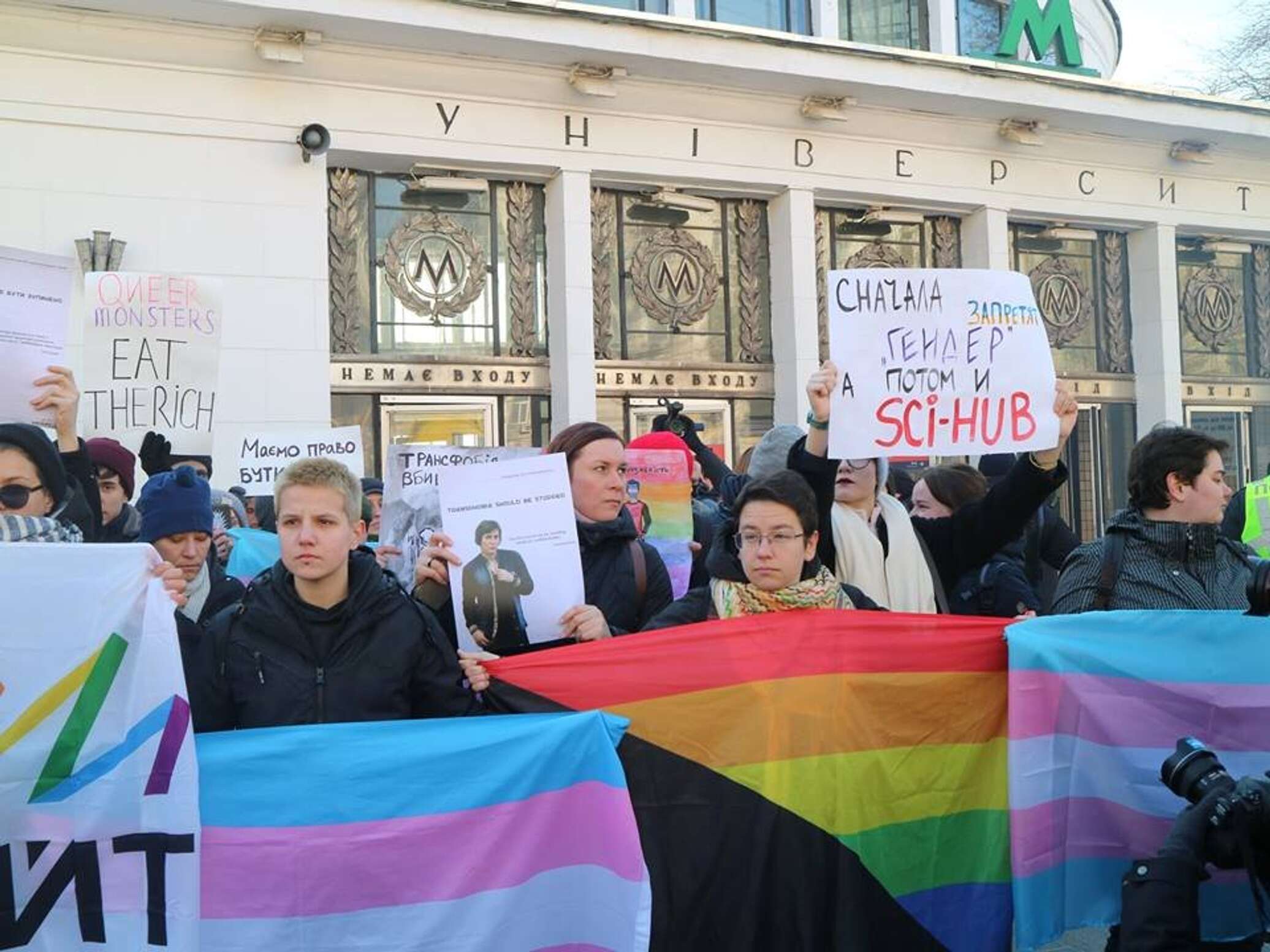 Чтобы избежать столкновений, поддерживающие трансгендерных людей активисты изменили точку сбора, они встретились у станции метро «Университет».