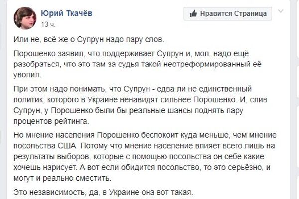 Главный редактор одесского издания «Таймер» Юрий Ткачев объяснил, зачем президент Украины Петр Порошенко в ущерб своему рейтингу поддержал гражданку США Ульяну Супрун, которую накануне суд отстранил от должности исполняющей обязанности министра здравоохранения