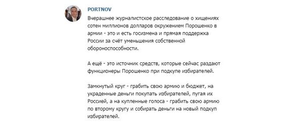 Вчерашнее журналистское расследование о хищениях сотен миллионов долларов окружением Порошенко в армии — это и есть госизмена и прямая поддержка России за счёт уменьшения собственной обороноспособности.