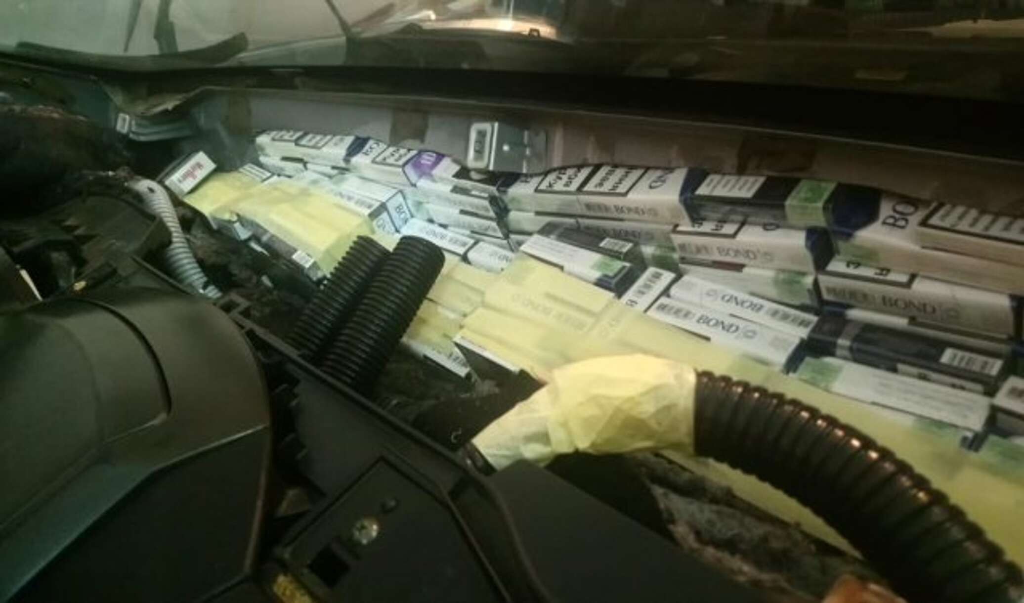 Авто было направлено на углубленный осмотр, именно там и обнаружили сигареты. Их мужчина спрятал в тайнике между салоном автомобиля и отсеком двигателя.