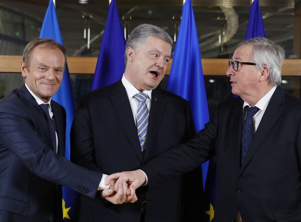 Президент Европейского совета Дональд Туск (слева) и президент Еврокомиссии Жан-Клод Юнкер (справа) приветствуют президента Украины Петра Порошенко (слева) в штаб-квартире ЕС в Брюсселе. 20 марта 2019 года
