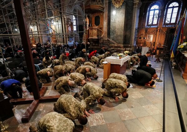 Украинские курсанты во время службы в иезуитской церкви (храм Святых Апостолов Петра и Павла) в центре Львова