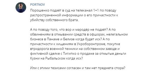 Экс-замглавы Администрации президента Украины Андрей Портнов считает, что своим иском к телеканалу «1+1» по одному из выдвинутых им тезисов президент Украины Петр Порошенко доказал правдивость всех остальных обвинений