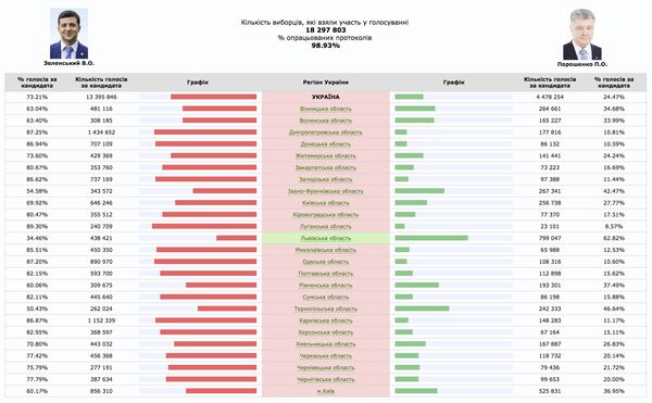По данным ЦИК Украины, самый высокий уровень поддержки Зеленский получил в Луганской области (89,05%), своей родной Днепропетровской (87,25%), а также в Одесской (87,25%). Восточные области в целом дали Зеленскому 87,7% голосов (за Порошенко проголосовали 11,2%).
