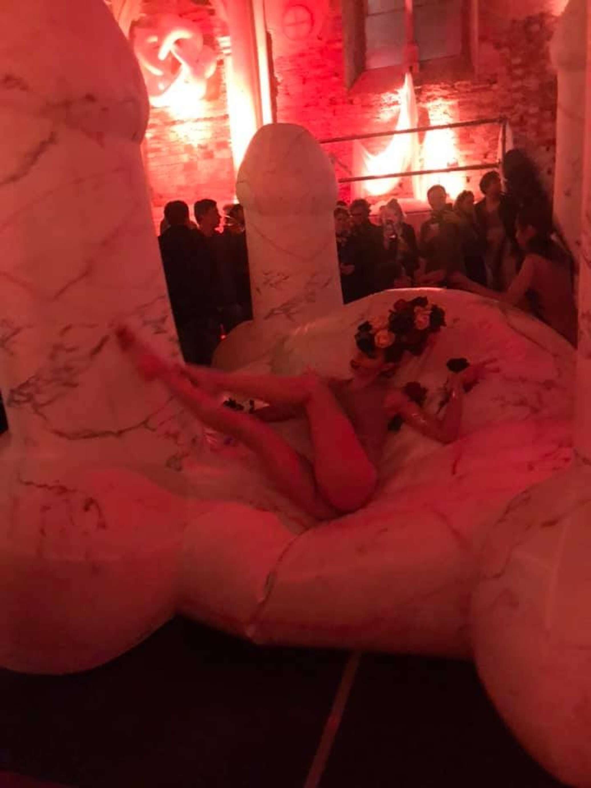 «Посреди церкви стояла огромная надувная конструкция из трехметровых х… и огромных грудей, такой надувной Стоунхэндж… Бритоголовые охранники в черных строгих костюмах отгоняли напившихся бесплатным просекко роковых женщин на шпильках. <…> В программе были разные непотребства, демонстрации голых красивых тел, выступления женских панк-групп, знаменитая Саша Фролова (художница — ред.) в латексе», — написал Боченков.
