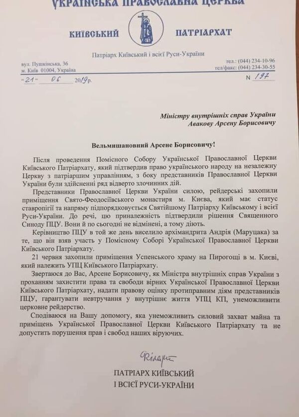 В пятницу, 21 июня, непризнанный киевский патриарх обратился с официальным письмом к министру внутренних дел Арсену Авакову. В документе, копию которого выложил