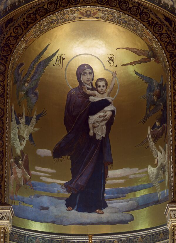 Под угрозой было даже настоящее сокровище Владимирского собора и, безусловно, мировой шедевр — образ Богоматери на запрестольный апсиде (округлой части потолка над алтарём). Образ этот был совершенно нетипичным — до Васнецова так никто не рисовал. Ключевым моментом был маленький Иисус, раскинувший руки навстречу миру (Виктор Михайлович писал своего сына Мишу). Риск того, что изображение будет забраковано, был чрезвычайно велик.