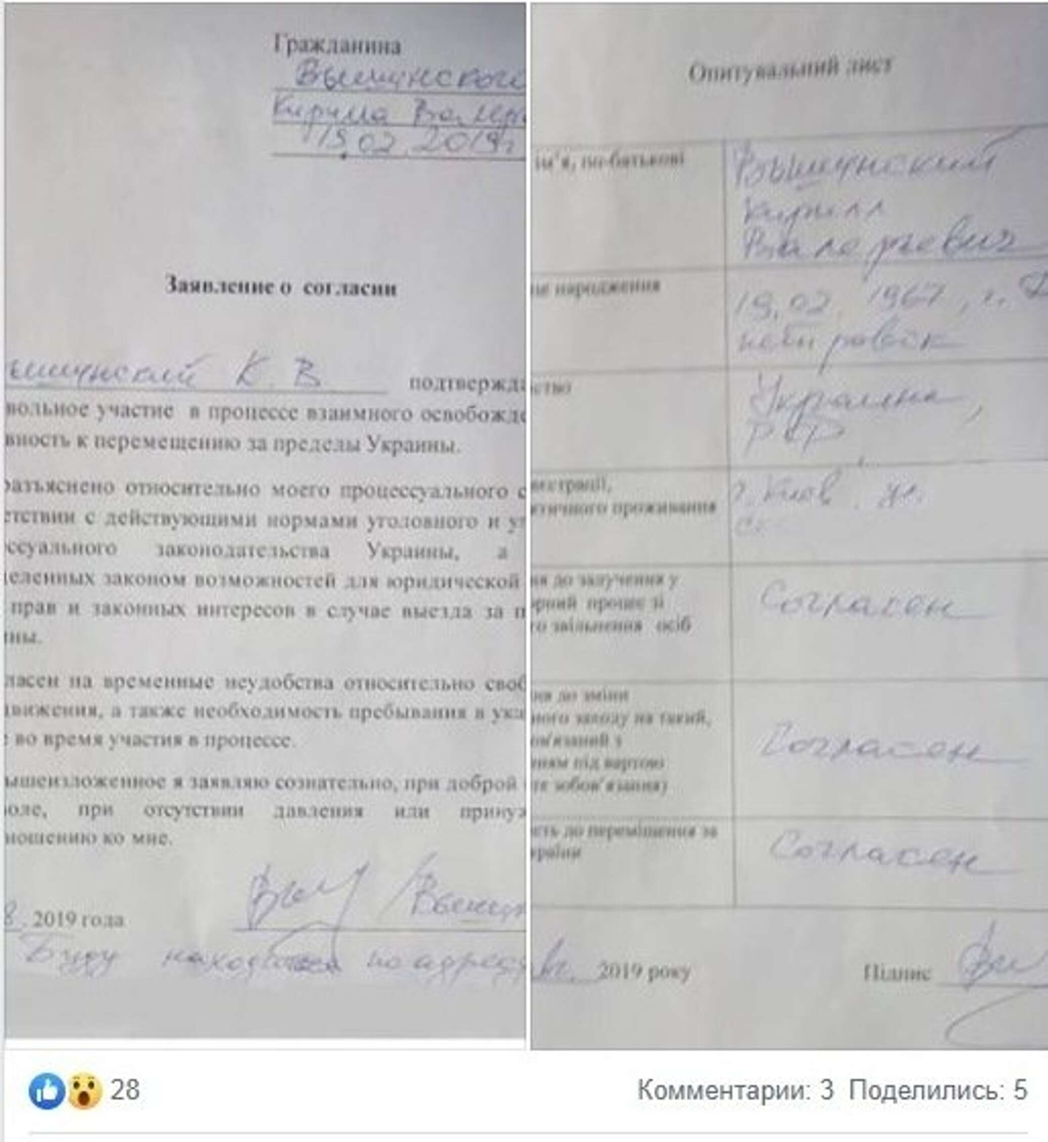 Ранее она утверждала, что изменение меры пресечения для Вышинского состоялось в рамках подготовки к обмену «35 на 35». К посту она приложила скан-копию бумаги, якобы подтверждающей верность ее слов.