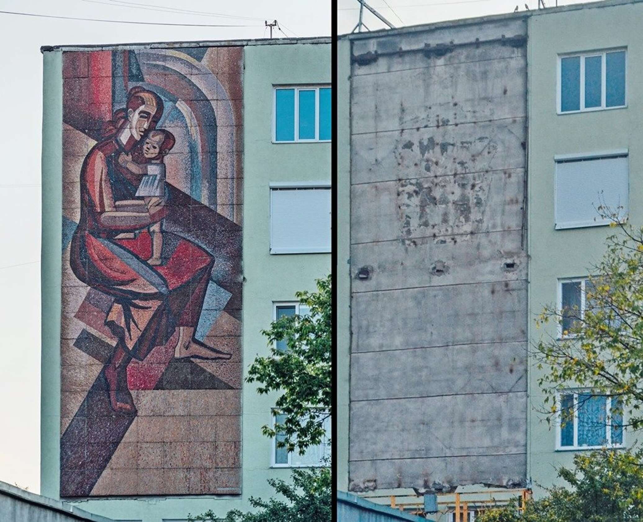 На здании черниговского роддома в рамках декоммунизации разобрали мозаику «Материнство», созданную заслуженным художником Украины Евгением Павловым. Об этом 19 сентября сообщает публицист Андрей Манчук на своей странице в Facebook, прикрепив фотографию роддома до и после демонтажа