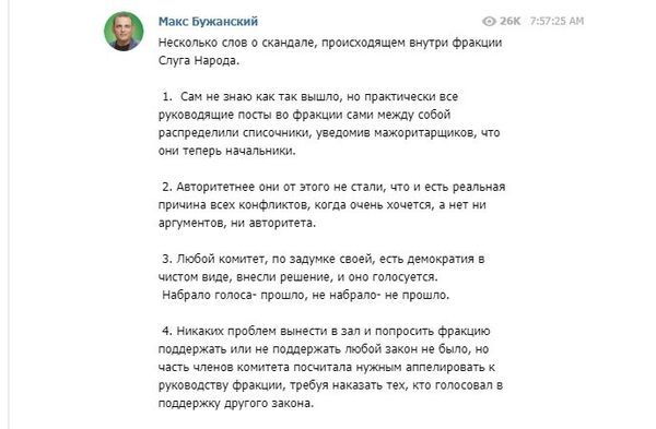 «Никаких проблем с тем, чтобы вынести в зал и попросить фракцию поддержать или не поддержать любой закон, не было, но часть членов комитета посчитала нужным апеллировать к руководству фракции, требуя наказать тех, кто голосовал в поддержку другого закона. Руководство фракции зачем-то вмешалось в демократический процесс голосования в комитете, и почему-то взяло на себя несвойственные и никем не делегированные функции арбитра. Забыв, что комитет парламентский, а не междусобойчик списочников. В качестве единственного аргумента упреков, руководство фракции ориентируется на слова Лещенко», — поделился депутат.