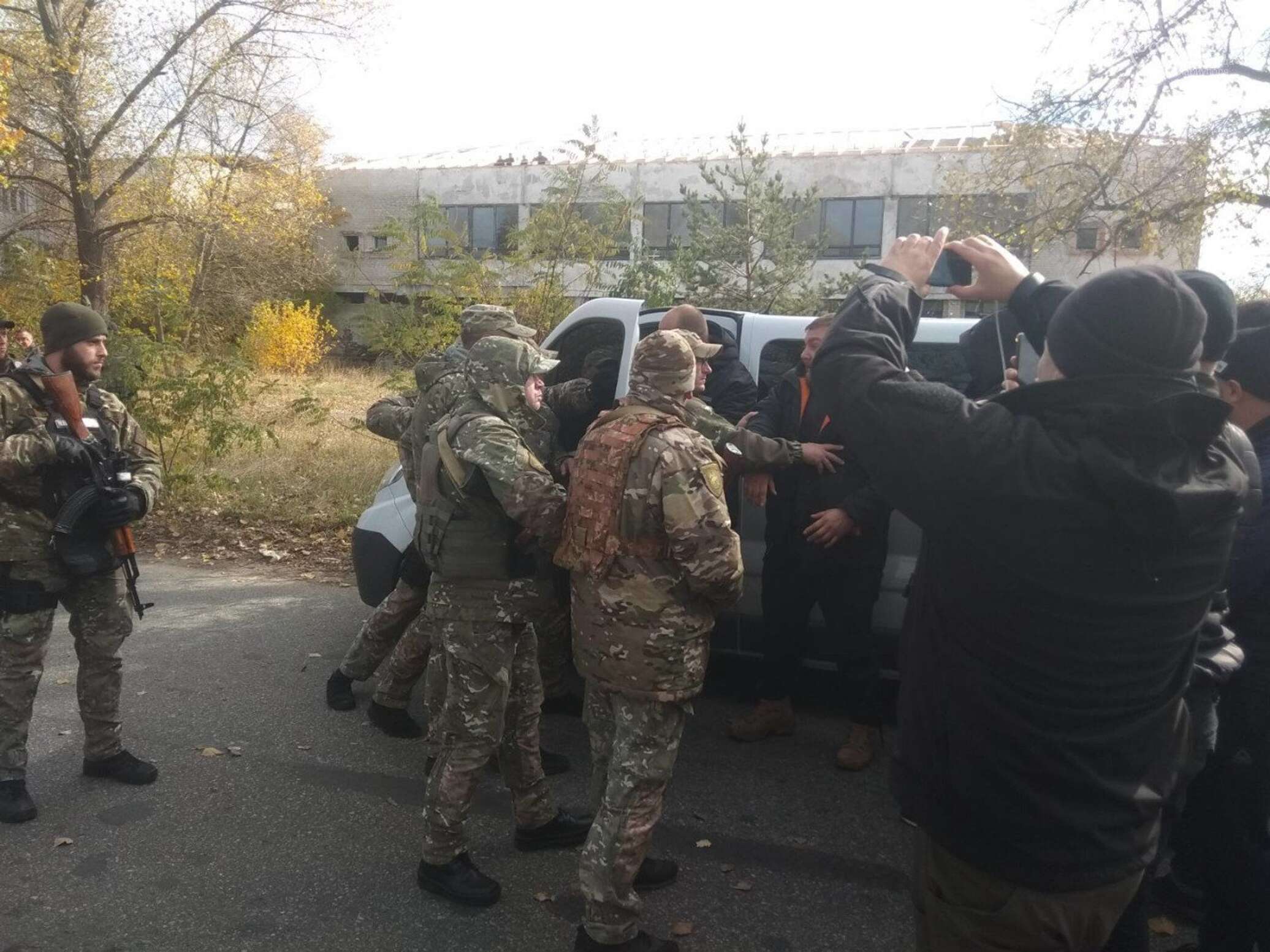 Националисты продолжают оставаться в Золотом, но их нет на линии укреплений-окопов, они не проявляют активных действий, но стоят группами поблизости от блокпостов, передает корреспондент издания.