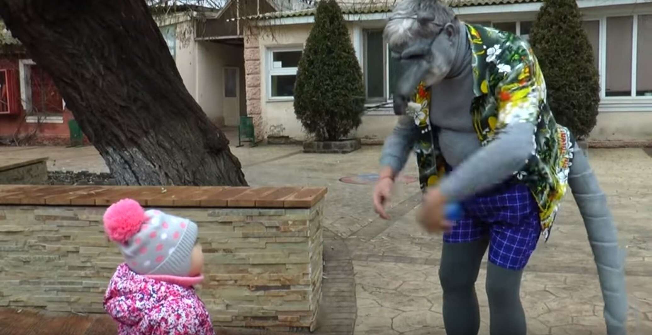 На видео директор в кустарно сделанном костюме крысы пританцовывает рядом с ребенком, сидящим на качелях.