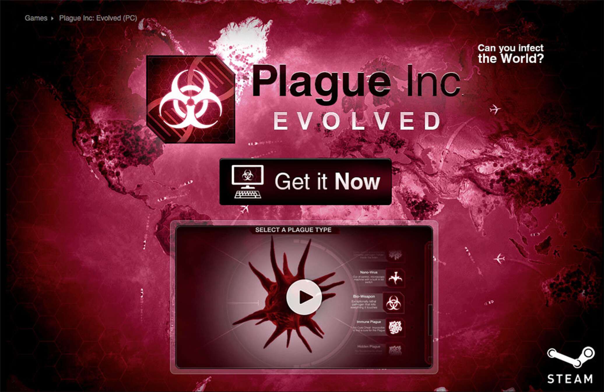 Plague Inc. — игра в жанре биологического симулятора. Главная цель в ней — контролировать развитие и распространение смертельной болезни, чтобы создать глобальную пандемию и уничтожить человечество. Появившись в мае 2012 года, Plague Inc. сразу завоевала популярность пользователей, вошла в ТОП-15 самых скачиваемых игр для iPhone и номинировалась на «Лучшую стратегическую игру года».