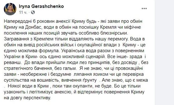 Глава партии «Голос» Святослав Вакарчук и депутат от «Европейской солидарности» Ирина Геращенко считают, что идея пустить воду в Крым в обмен на уступки со стороны президента РФ Владимира Путина по Донбассу недопустима. Об этом вечером 11 февраля они сообщили на своих страницах в Facebook