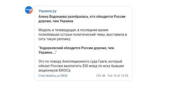 «Водонаева, в последнее время полюбившая острые политический темы, выставила в сеть такую реплику: "Ходорковский обходится России дороже, чем Украина…". Это по поводу Апелляционного суда Гааги, который обязал Россию выплатить 50 млрд долларов по иску бывших акционеров ЮКОСа», — говорится в посте.