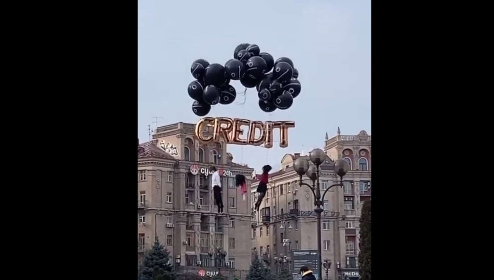 Над центром города пролетели черные шарики с огромной надписью "Credit" и привязанными к ней манекенами мужчины, женщины и ребенка (фигуры выглядели будто повесившиеся).